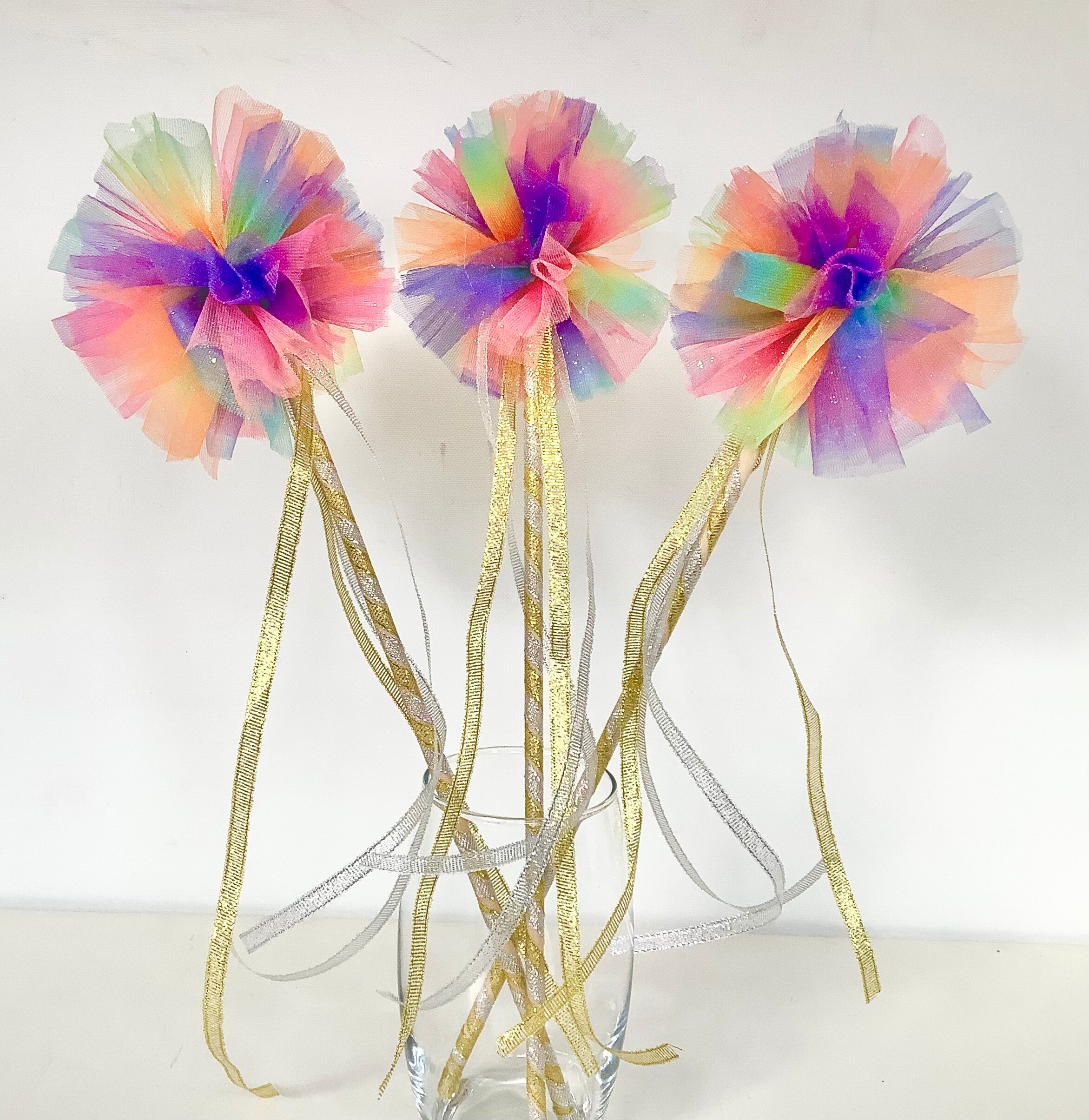 "Happy rainbow pom pom wand in glittery tulle with gold and silver shimmering ribbons. Ready fo...