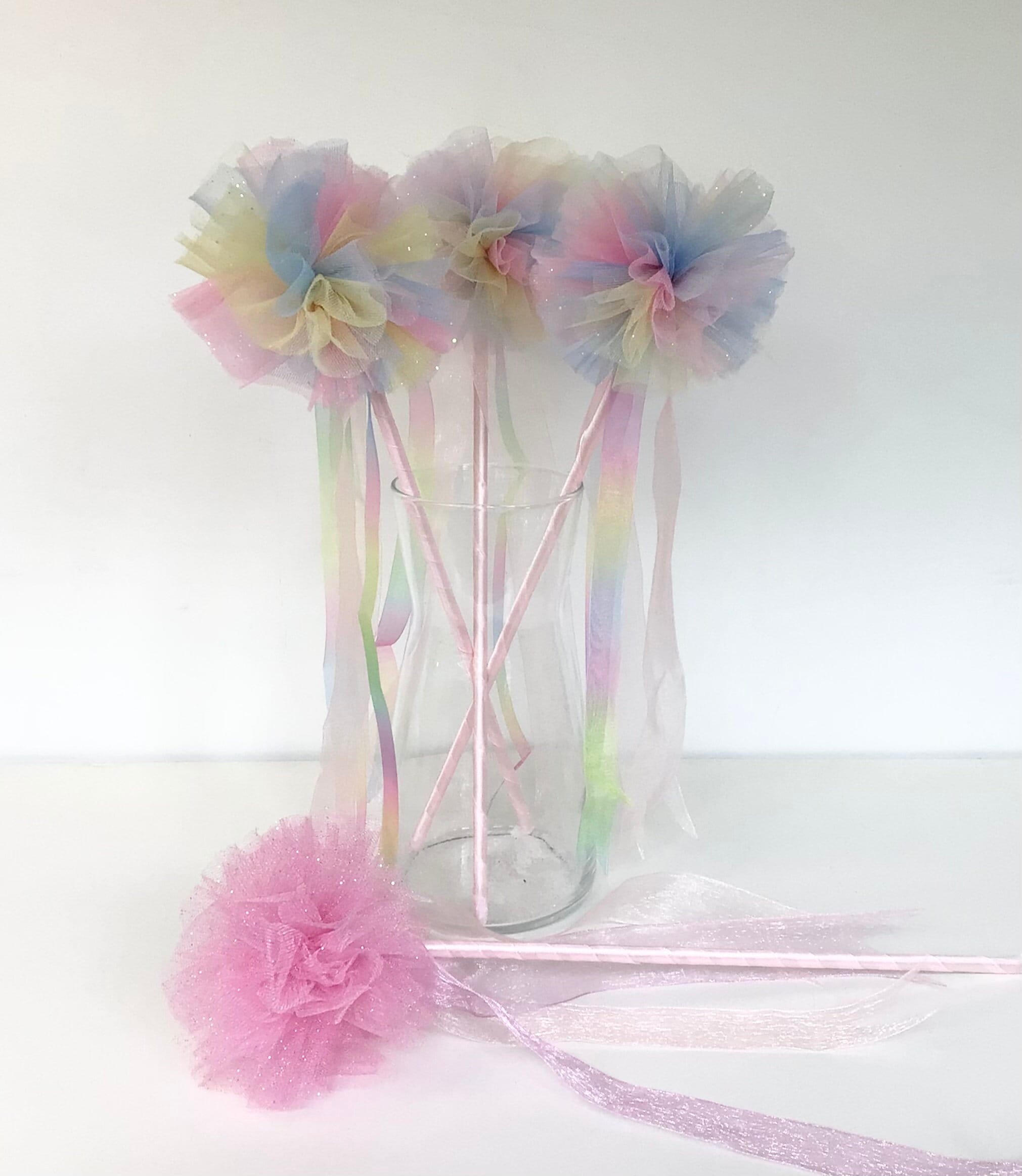 Rainbow tulle wand, pompom wand, princess party wand, tulle pom pom...