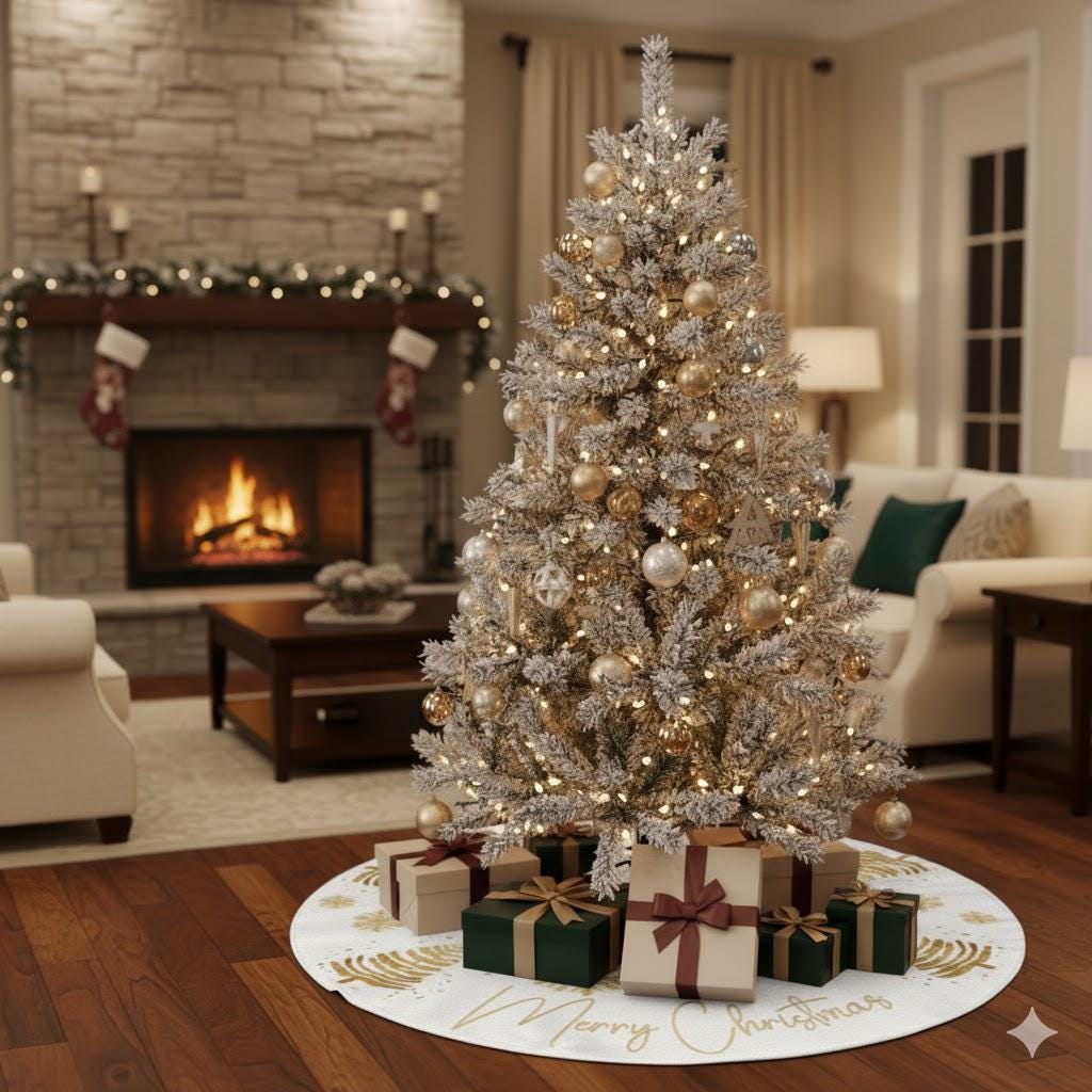"This white Tree Skirt with golden snowflake details exudes a festive and merry holiday vibe. P...