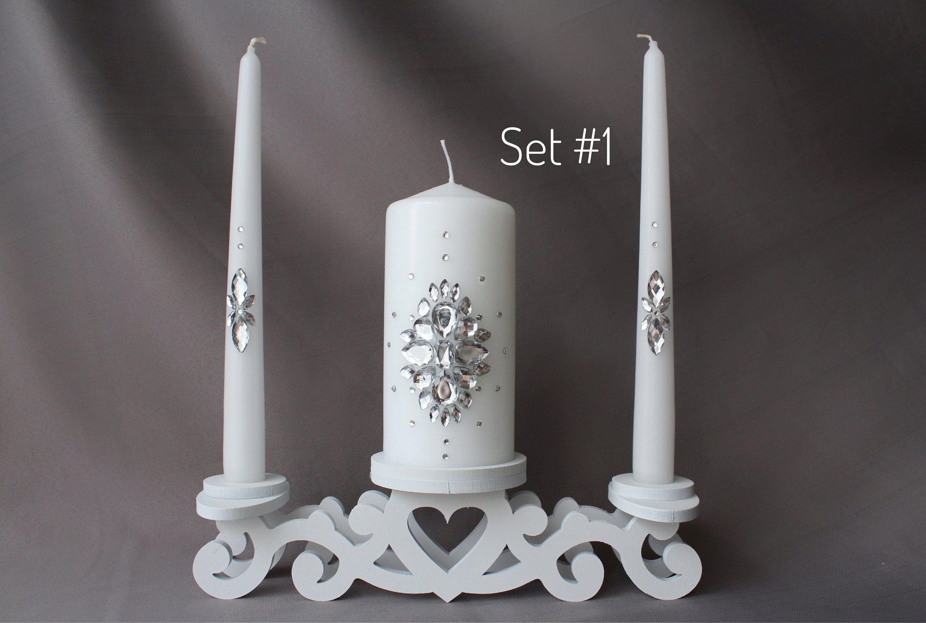 White unity candles set, Wedding favor candle, Wood candle holder, ...