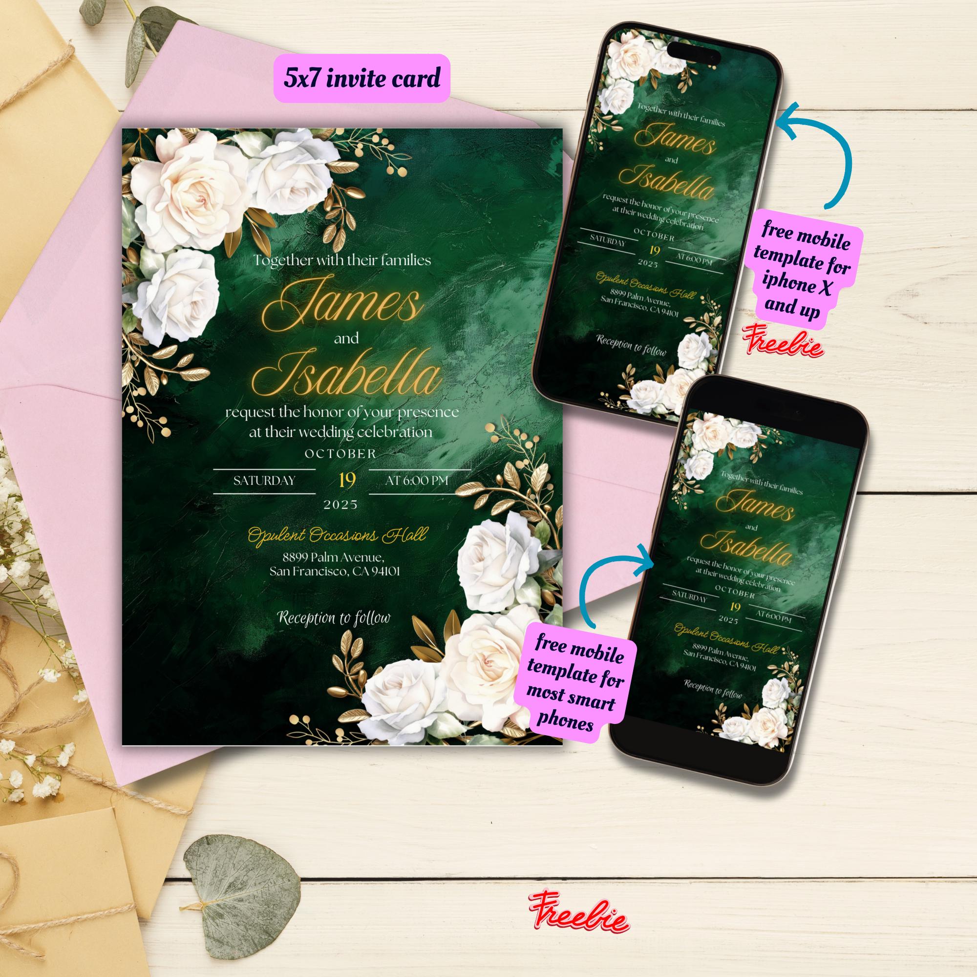 Editable Emerald Green Wedding Invitation Template, Gold and Green Floral Invitation, Dark Green Ele...