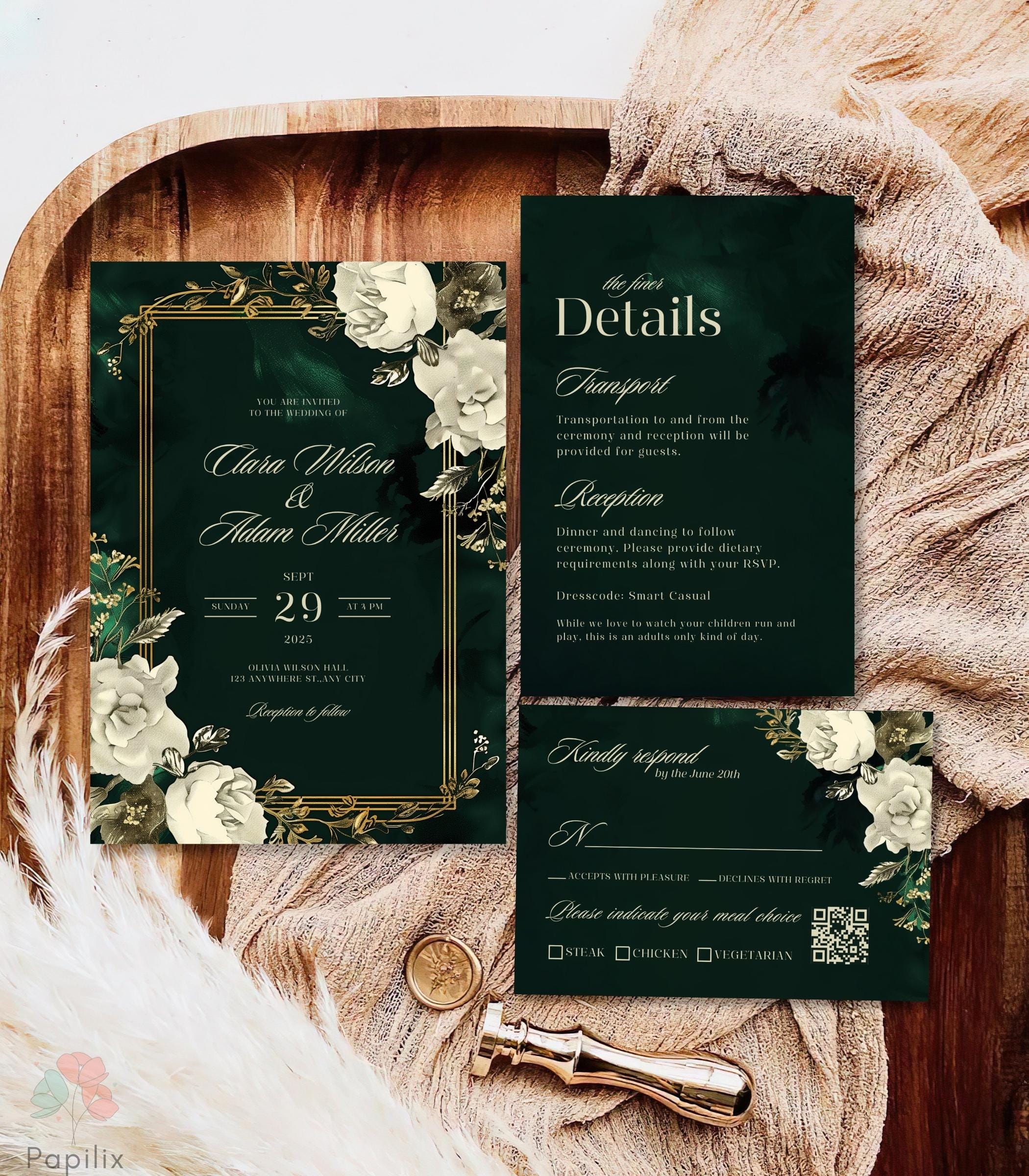 Emerald Green & Gold Wedding Invitation Set, Dark Green Floral ...