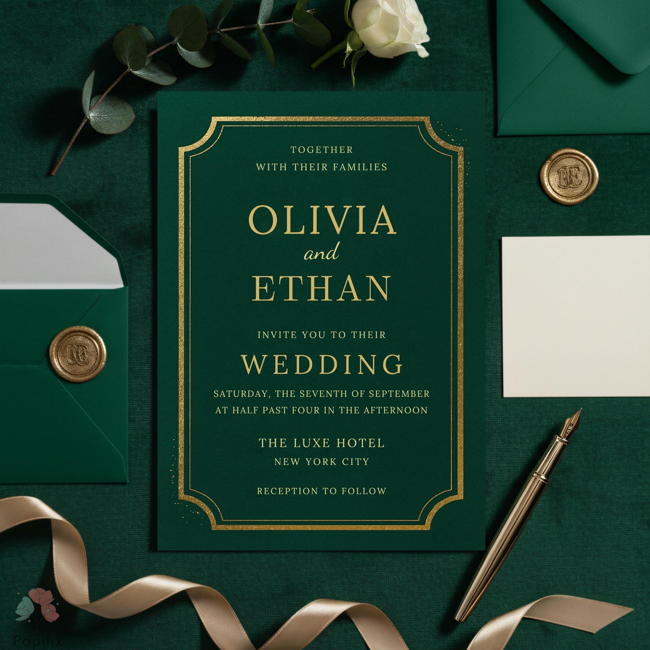 Elegant Emerald Green Wedding Invitation, Gold Foil Border Invite, ...