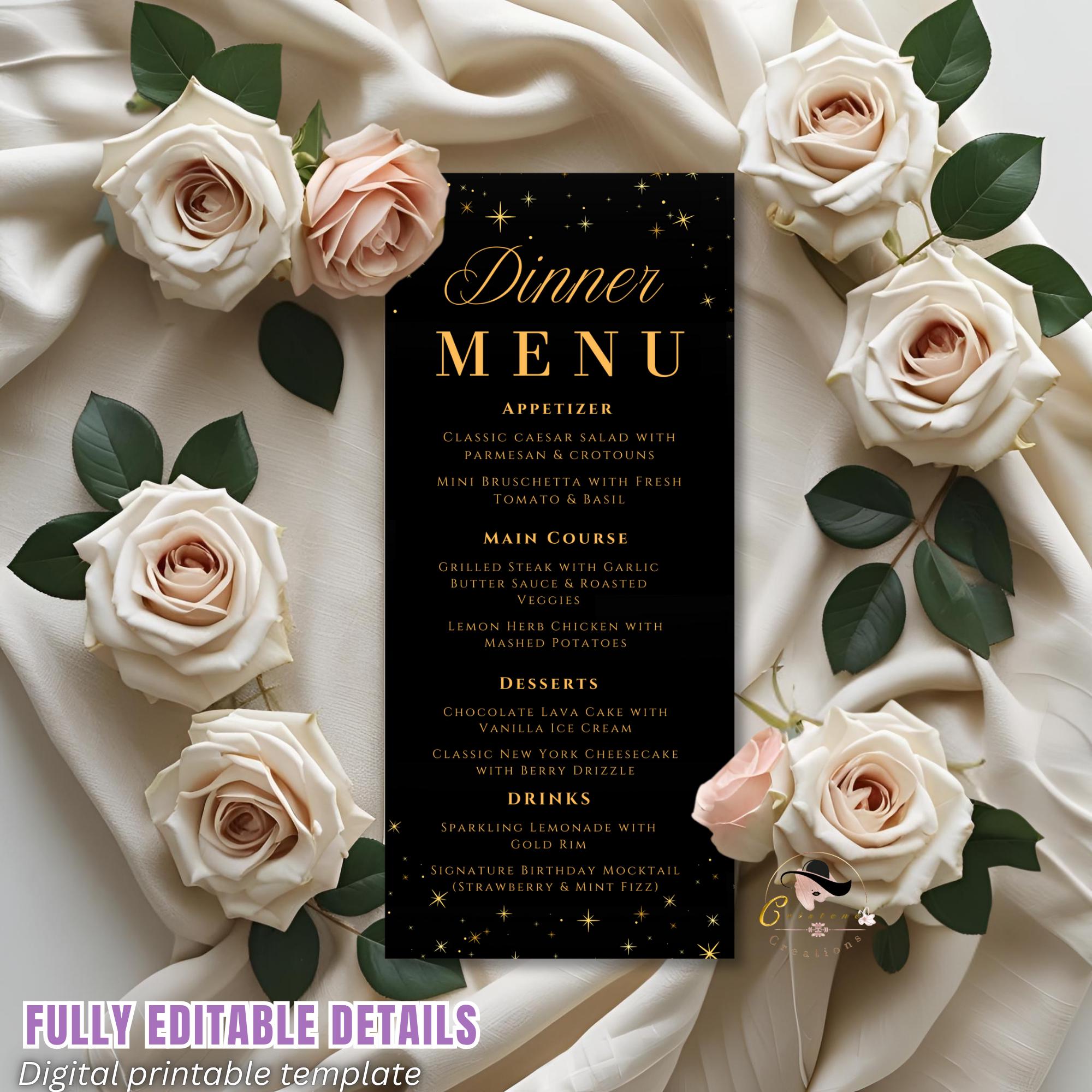 Editable Dinner party Menu template Black gold Menu cards printable...