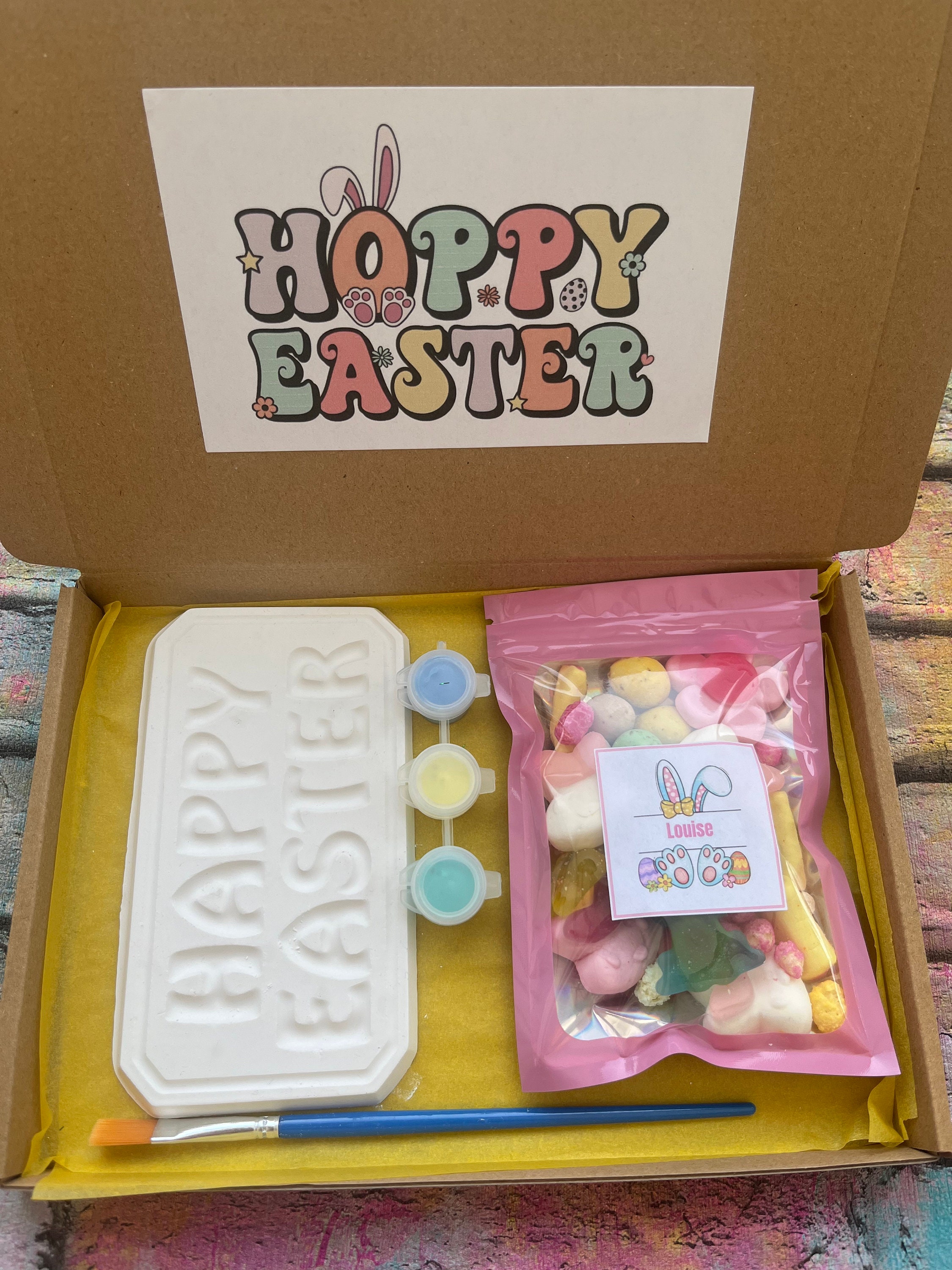 Easter gift box An Easter gift box containing a Easter plaque to paint and a personalised sweet pouc...