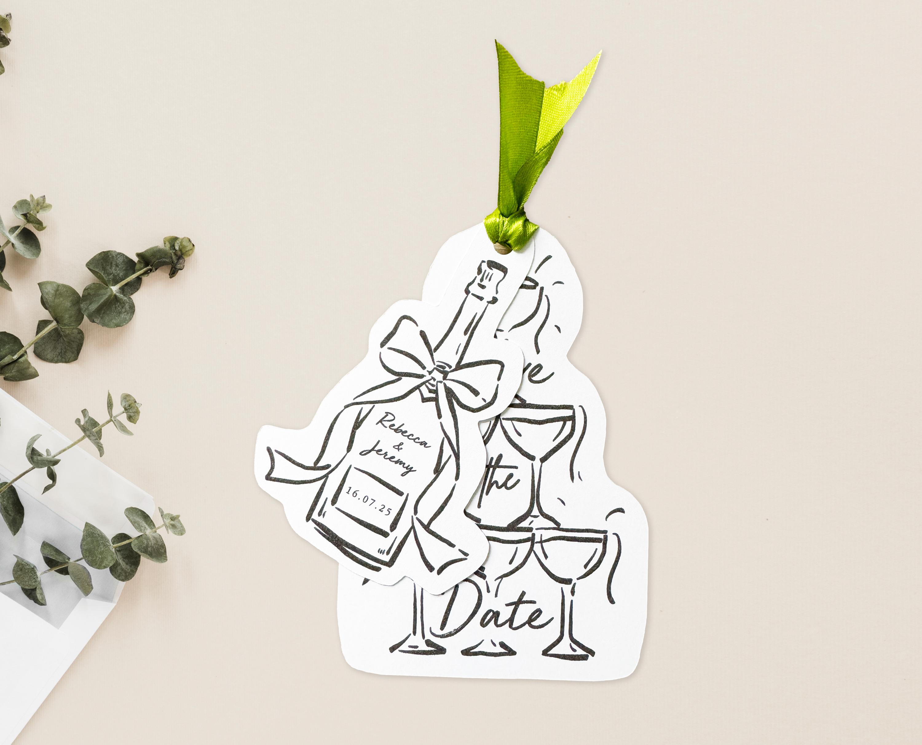 This luxury save the date features a hand illustrated champagne bottle with your names and wedding d...