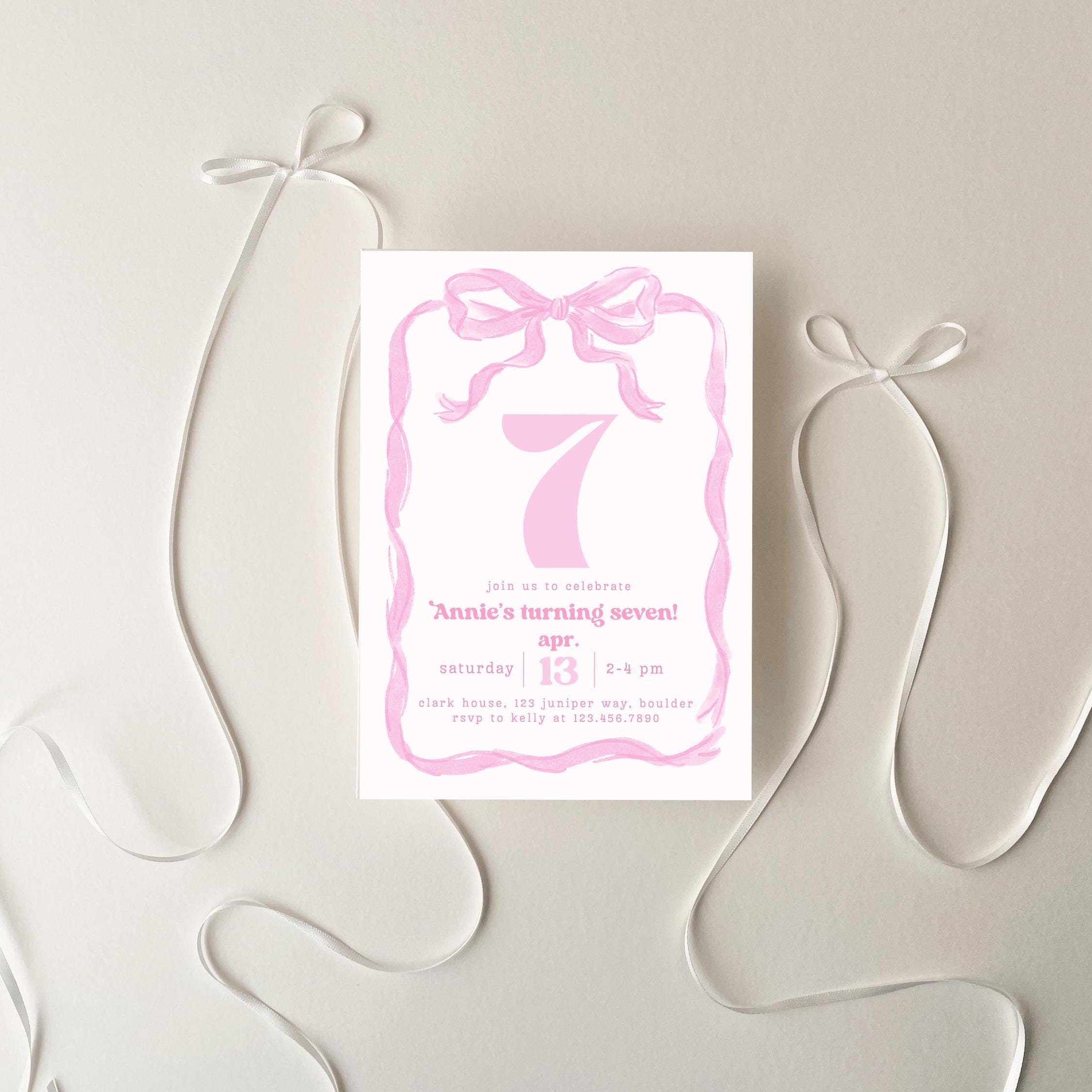 Coquette Pink 7th Birthday Invitation Girl Pink Bow Mobile 7th Birt...