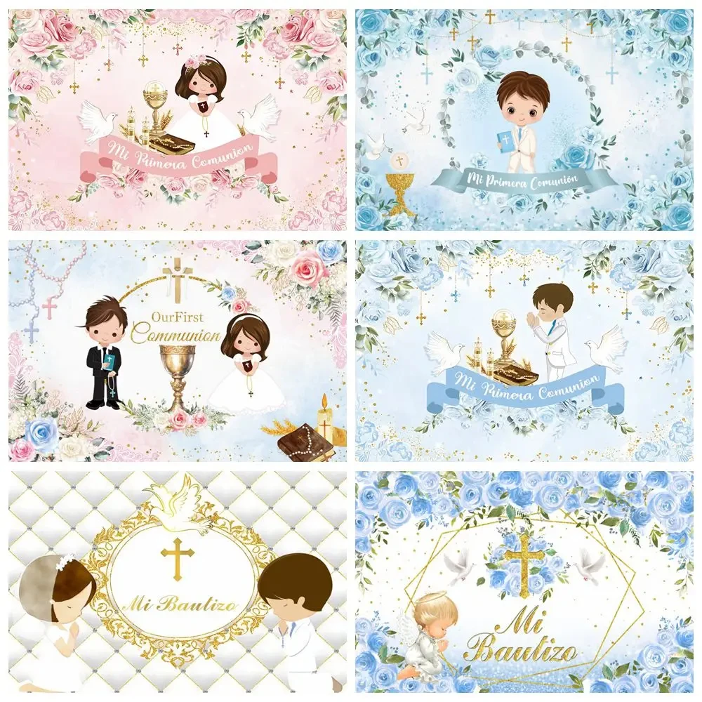 Boy Girl First Communion Photography Backdrop Decor Gold Cross Grail God Bless Baptism Christening B...