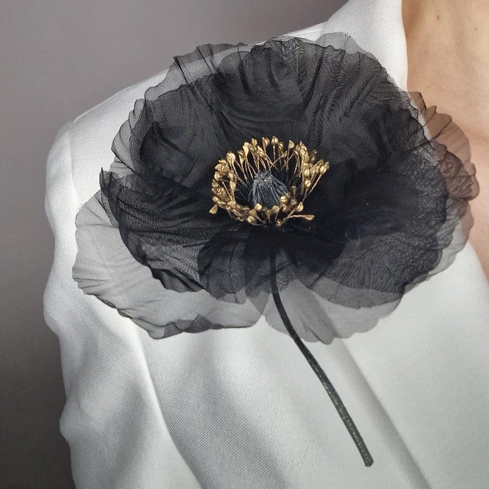 This elegant black flower brooch is a timeless accessory crafted from delicate organza in black and ...