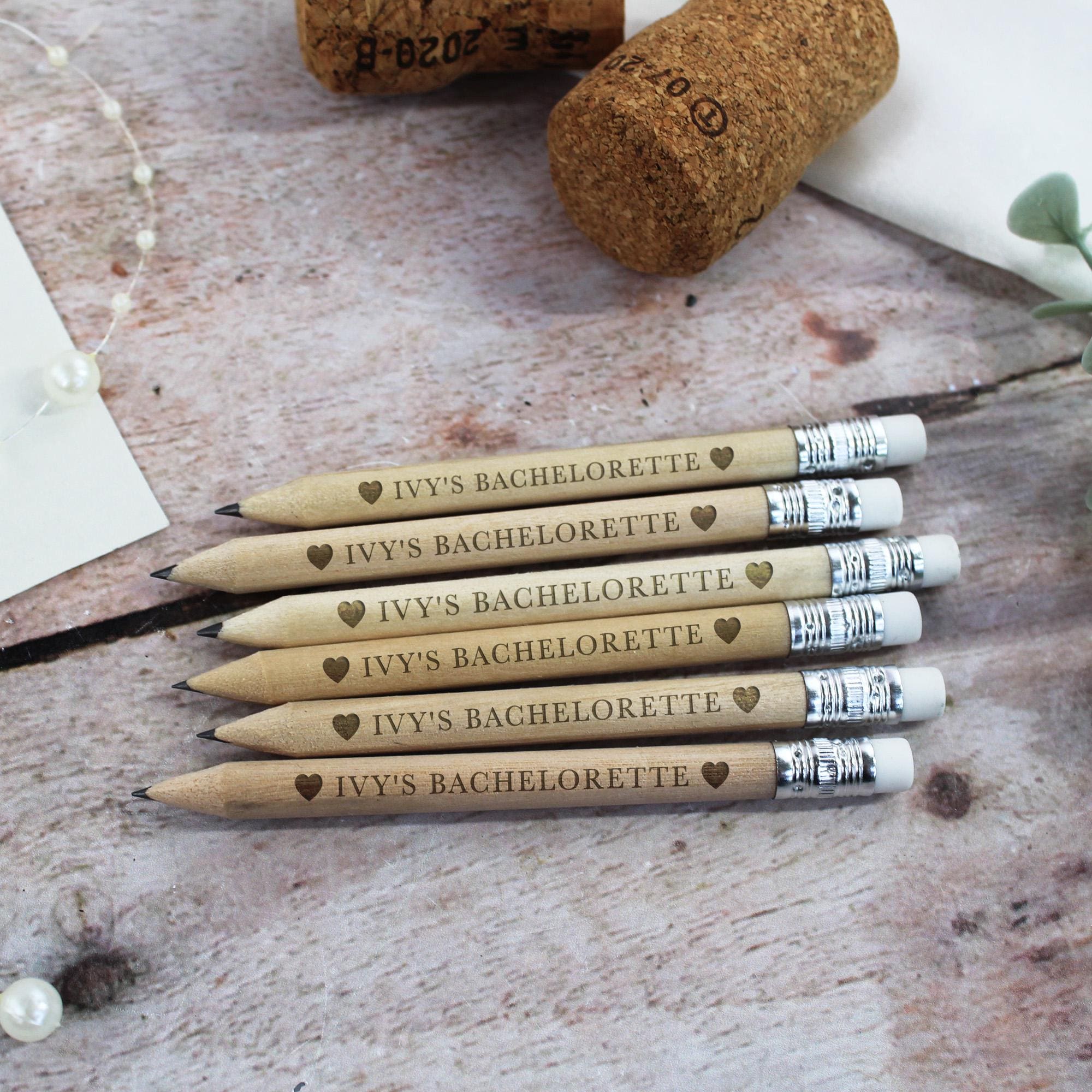 "Bachelorette Favors, Personalised Bridal Shower Pencils, Engraved Minature Pencils, Wooden Pen...