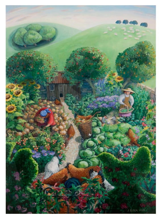 Chickens and vegetables! A traditional vegetable garden full of flowers and veg at harvest time. Lad...