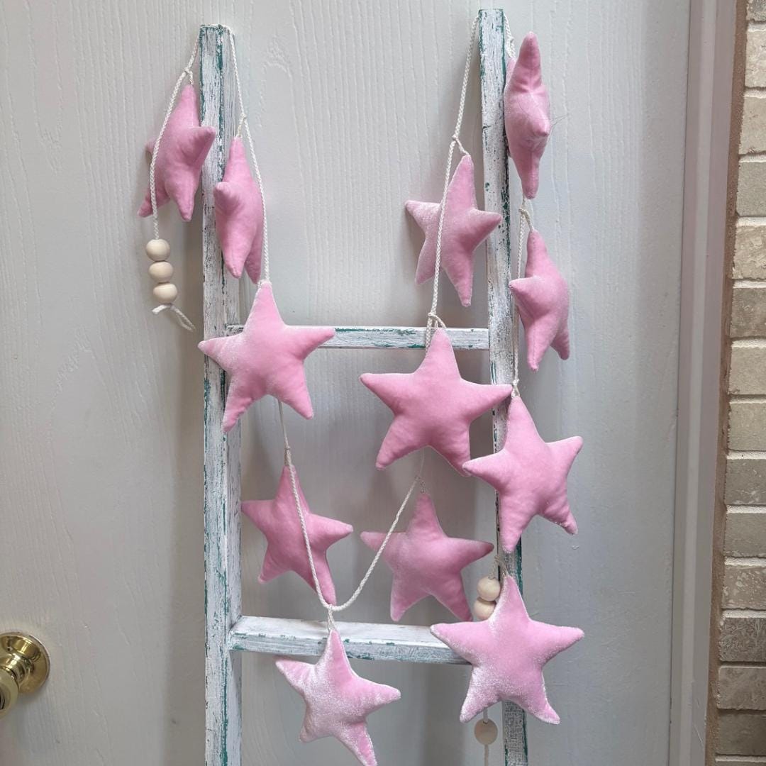 "Baby pink velvet stars garland with wooden beads creates a beautiful nursery room, kids' playr...