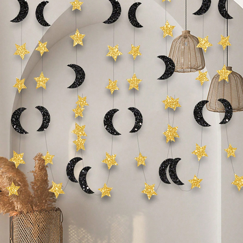 3m Ramadan Eid Glitter Moon and Star Garland, Sparkling Hanging Ban...