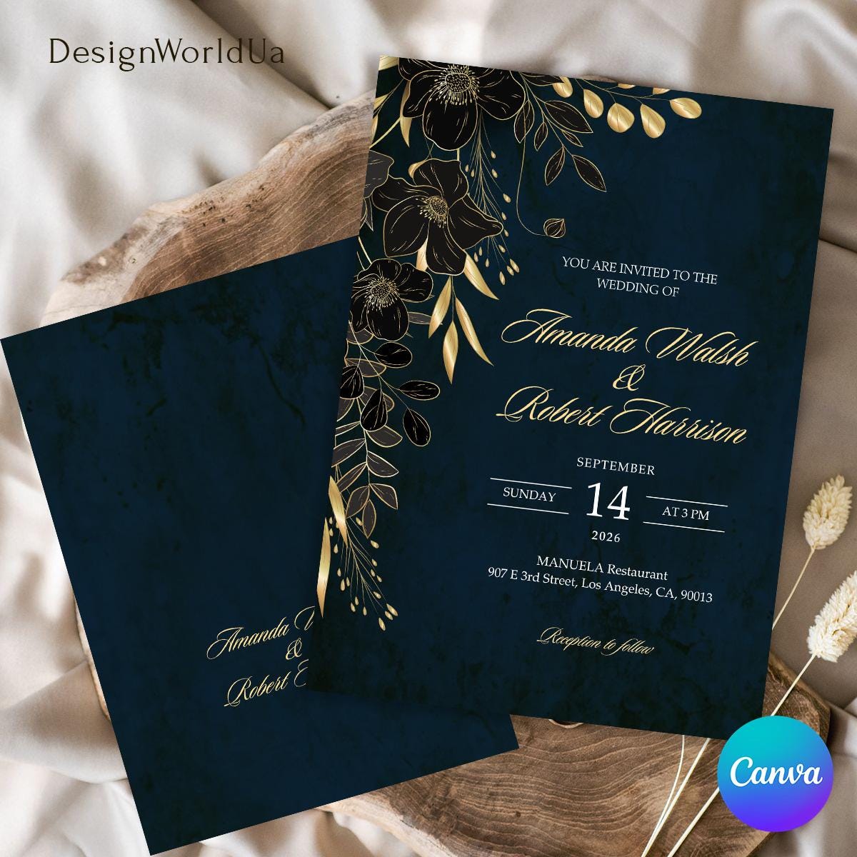 Navy Blue Gold Wedding Invitation, Dark Blue Floral Elegant Invite,...