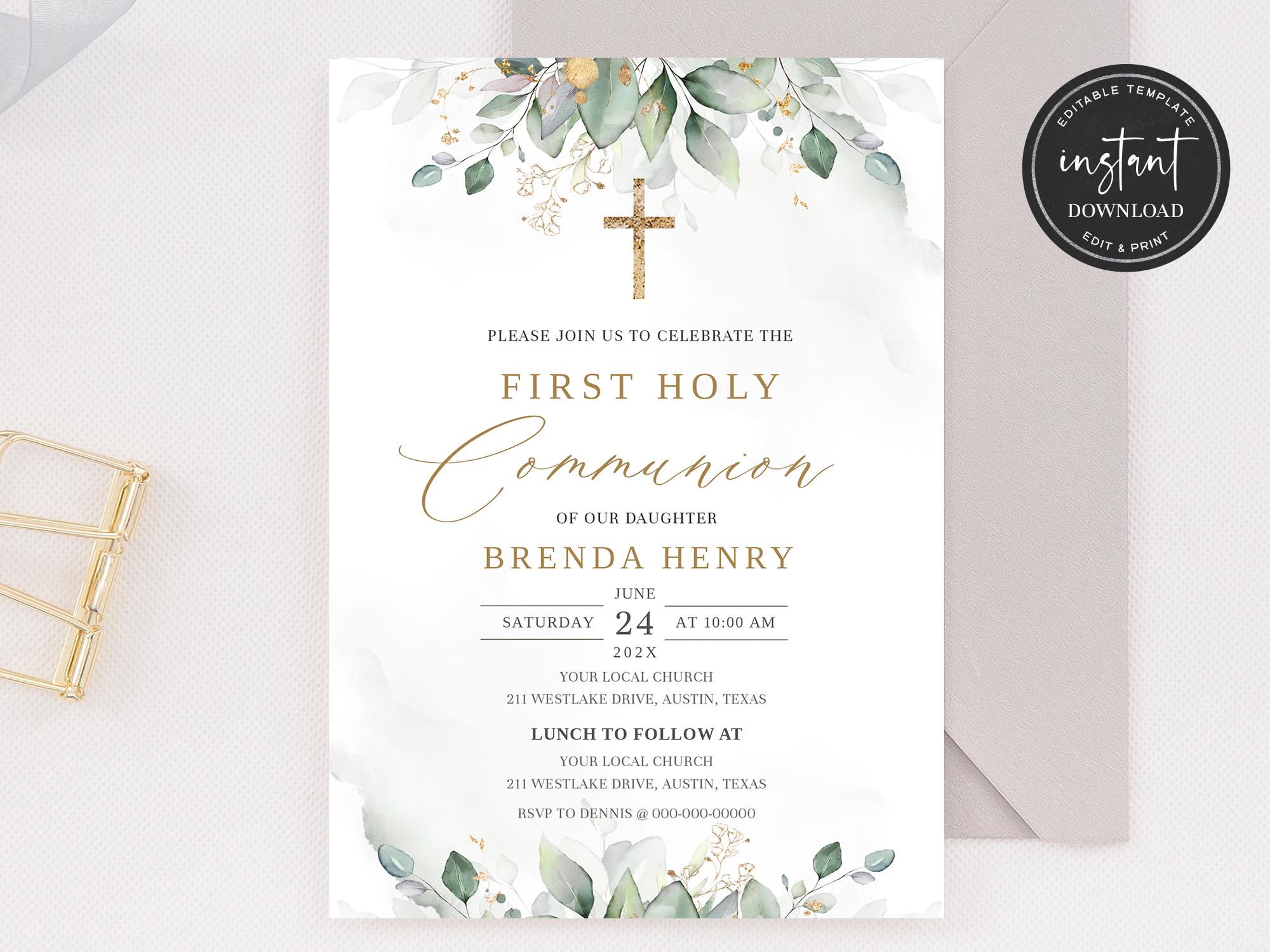 First Communion Invitation Template, Greenery First Holy Communion ...