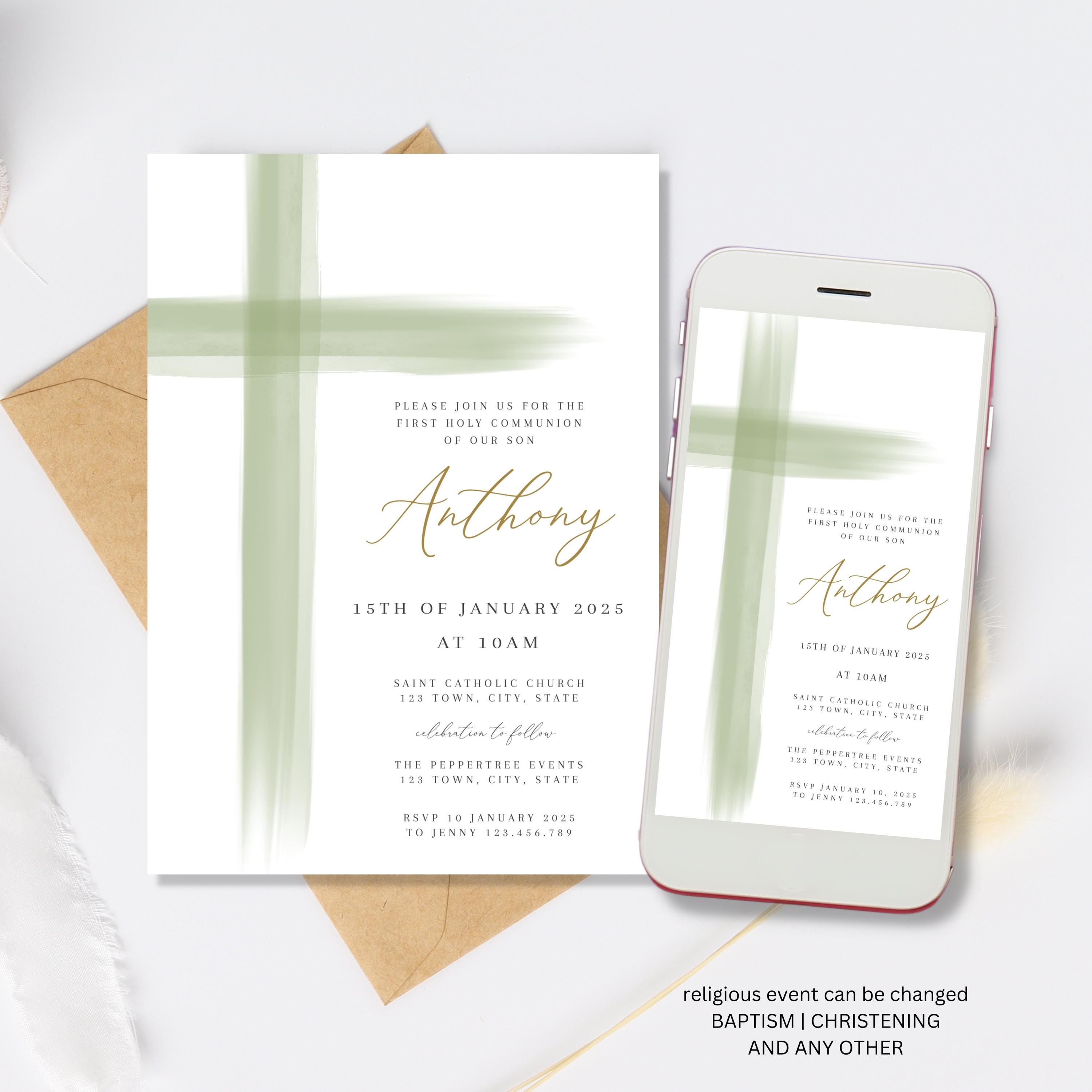 Green Holy Communion Invitation Template, First Holy Communion invi...