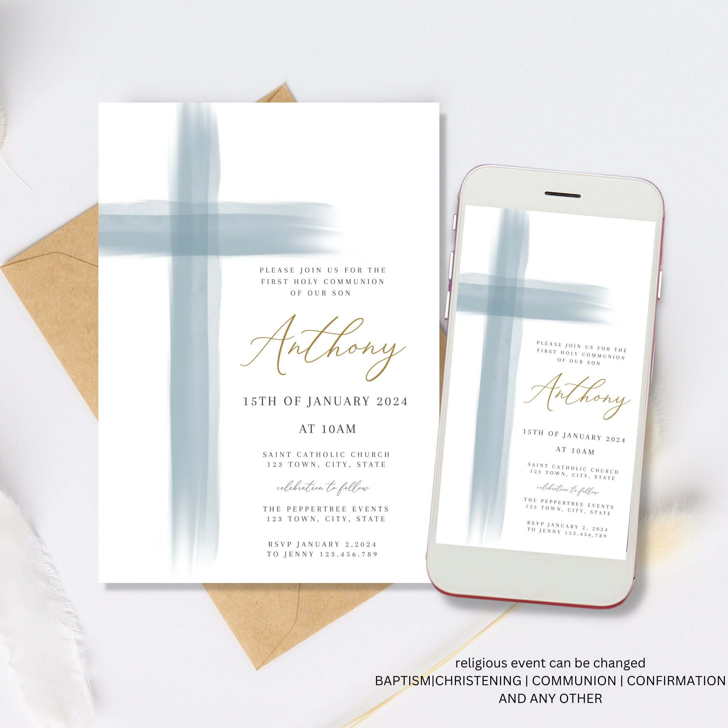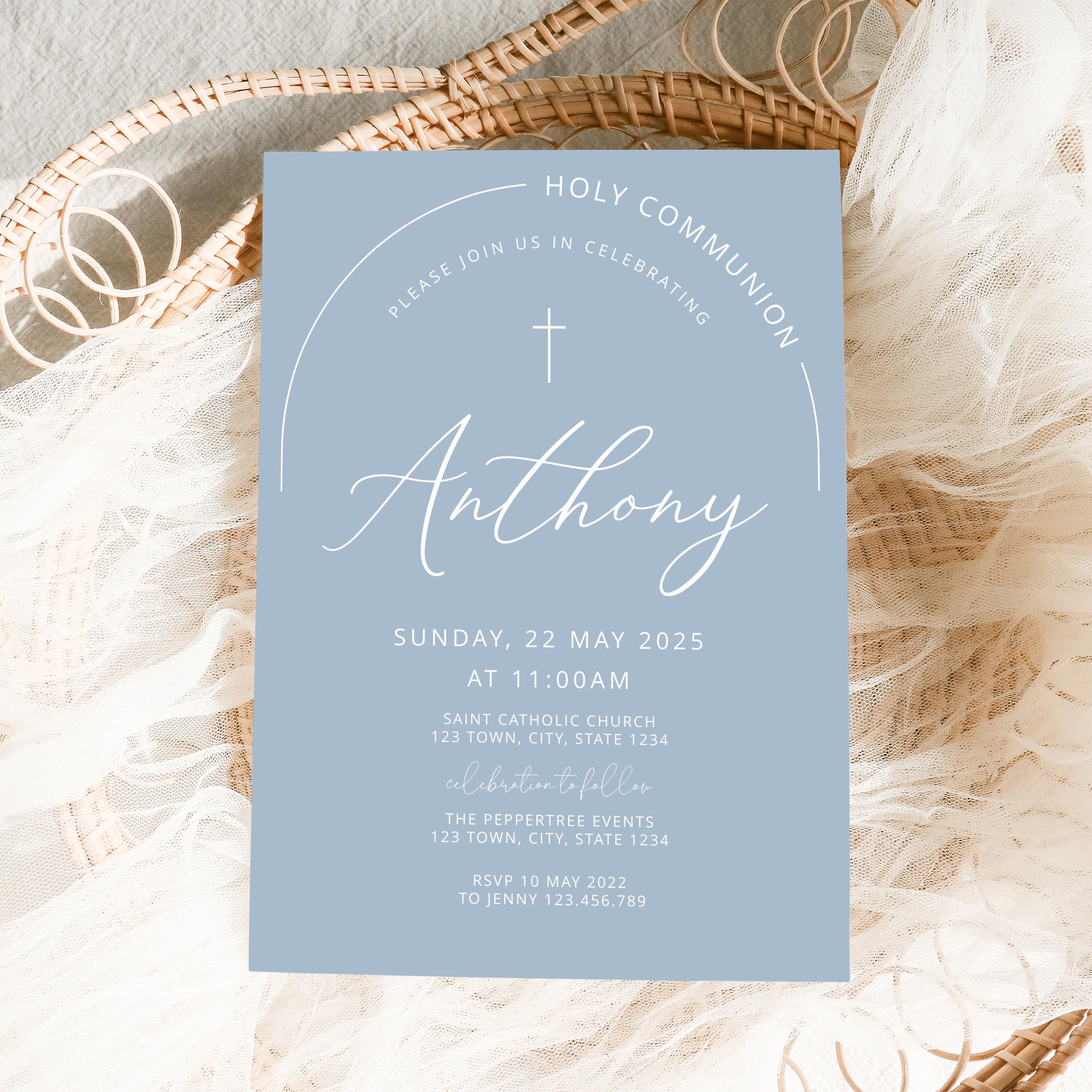 "Blue Holy Communion Invitation Template, First Holy Communion invite, Boy Communion Invite, Ar...