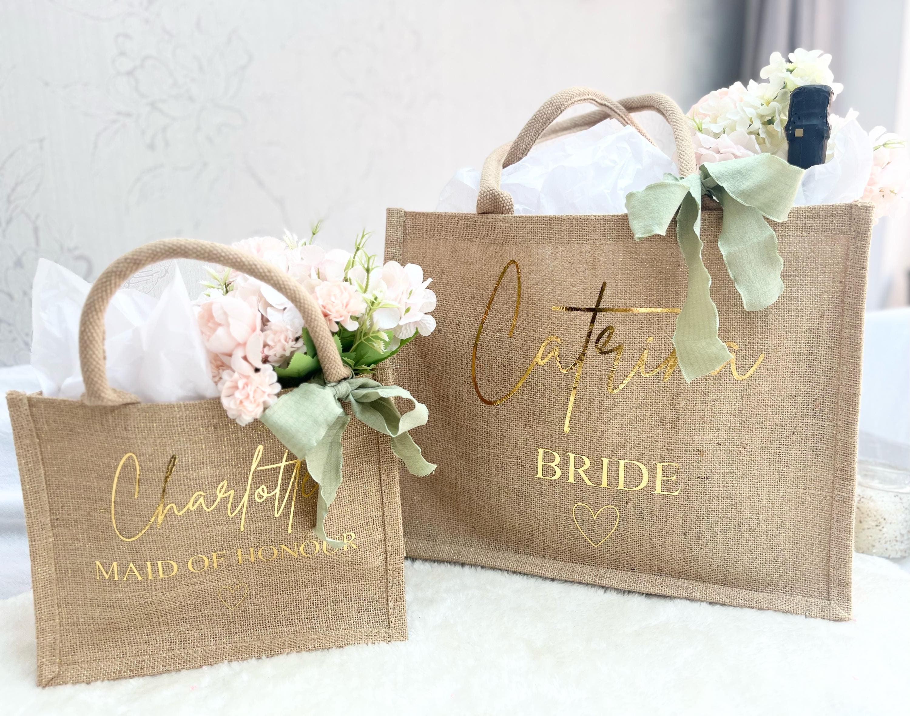 Personalised Shimmer Bridal Party Jute Bags - Custom Gifts for Bride & Bridesmaids Make your wed...