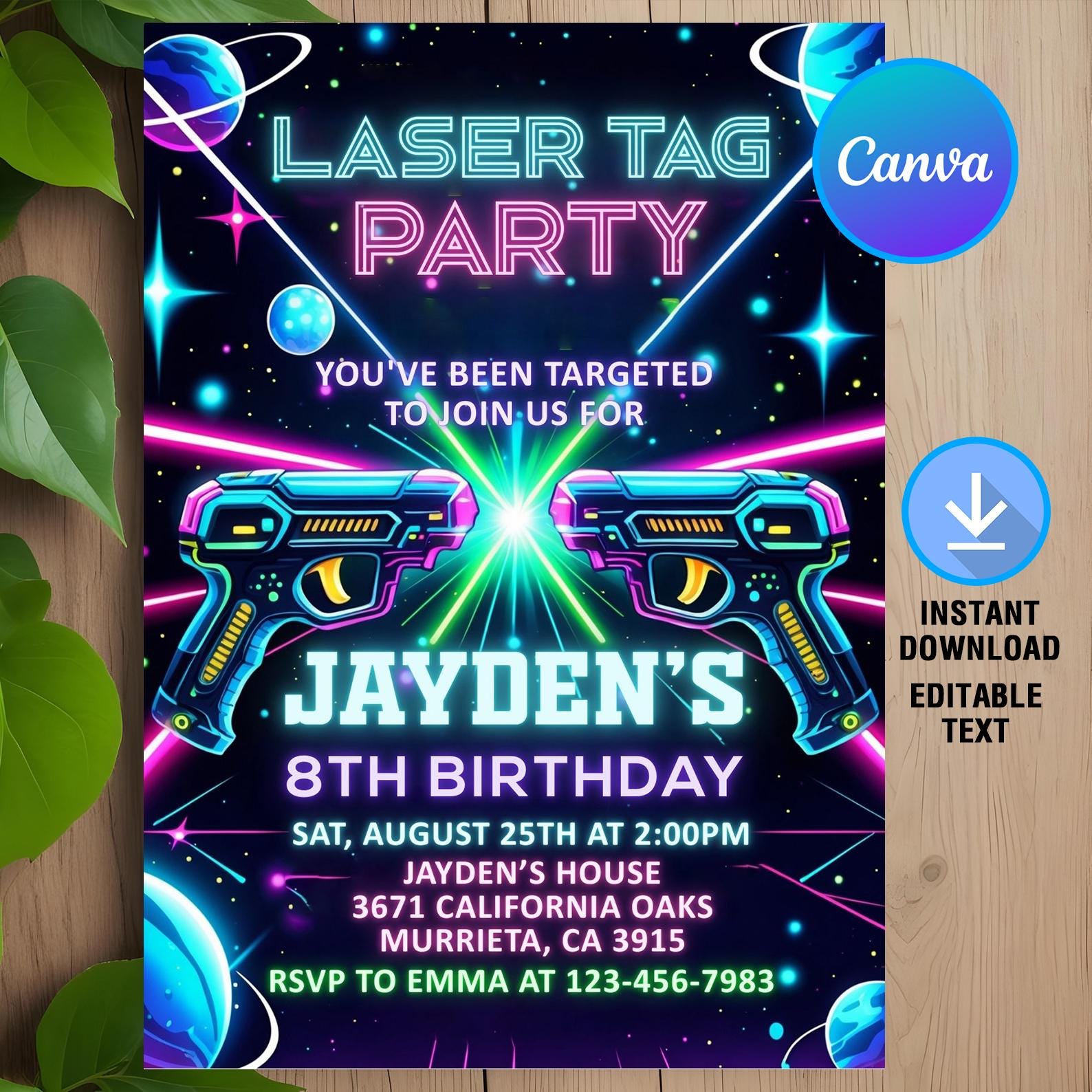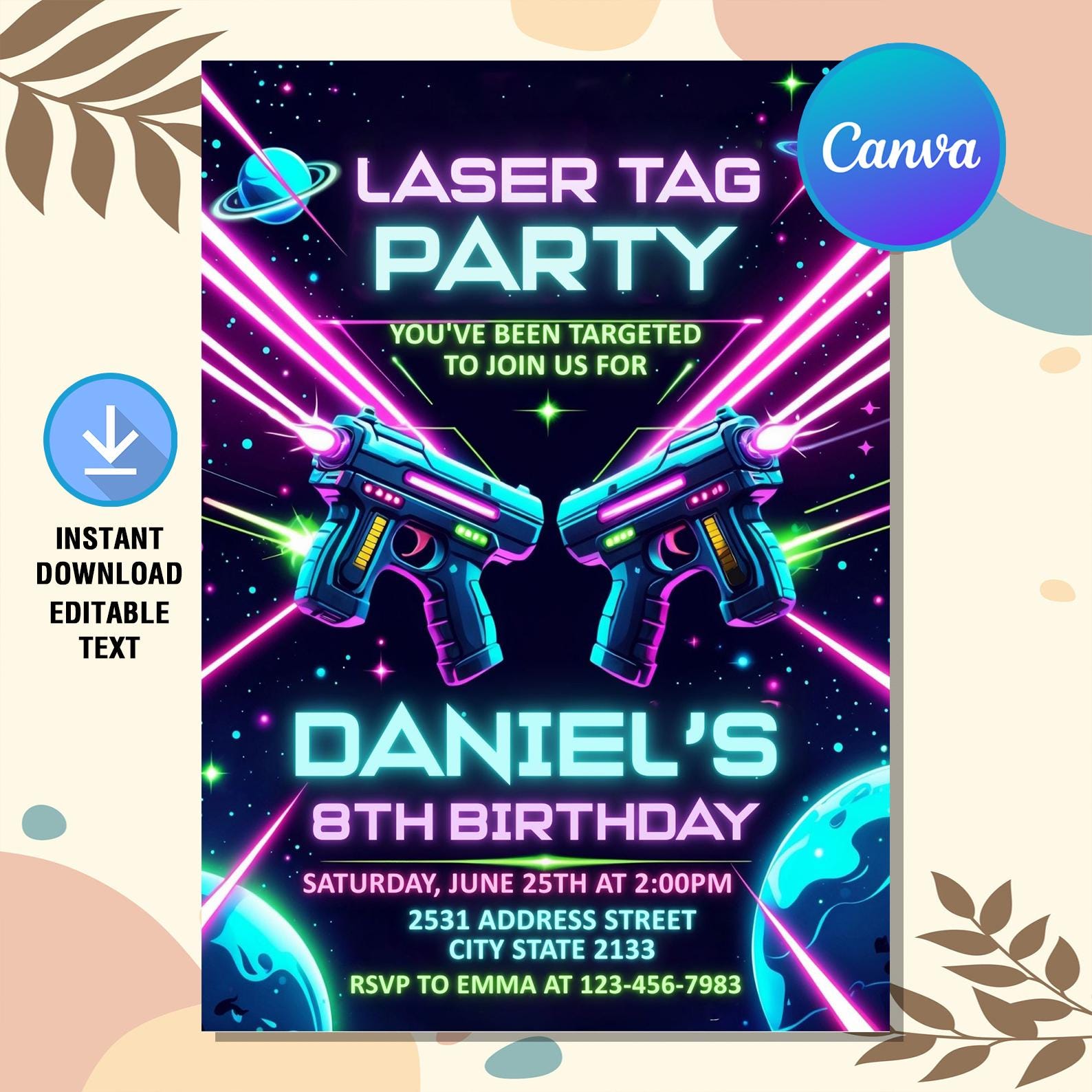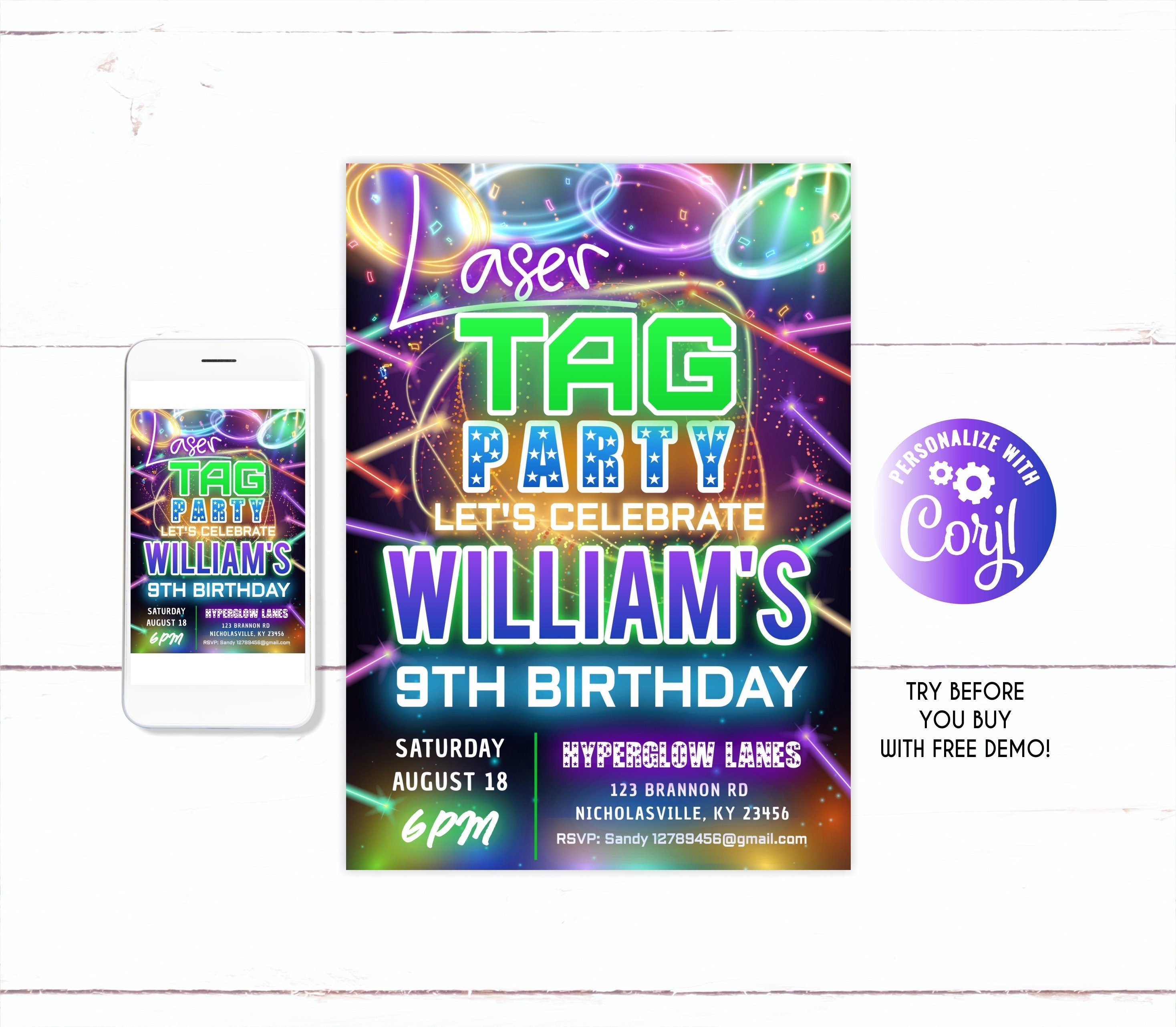 "Laser Tag Birthday Invitation Template, Neon Glow, Green Blue Glow, Laser Tag Invite, Laser Ta...