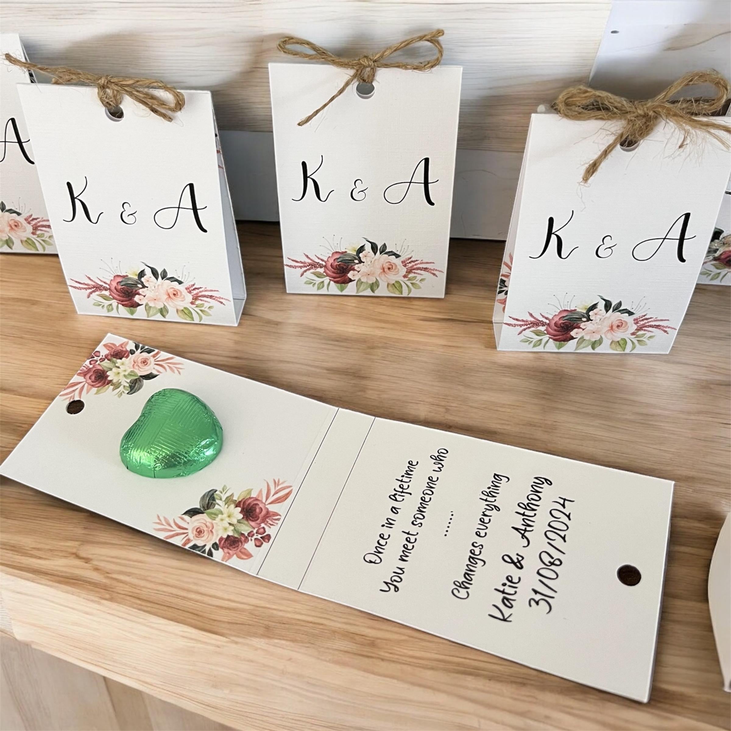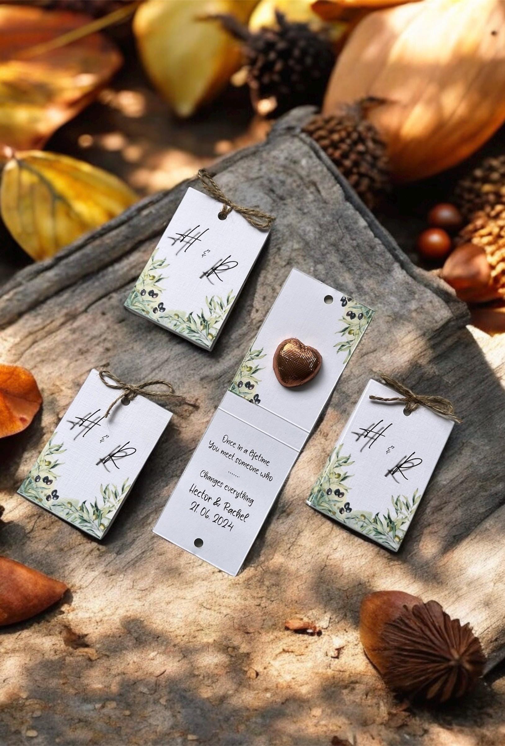 "Chocolate heart wedding favours.. A beautiful folded tag style card completed with chocolate h...