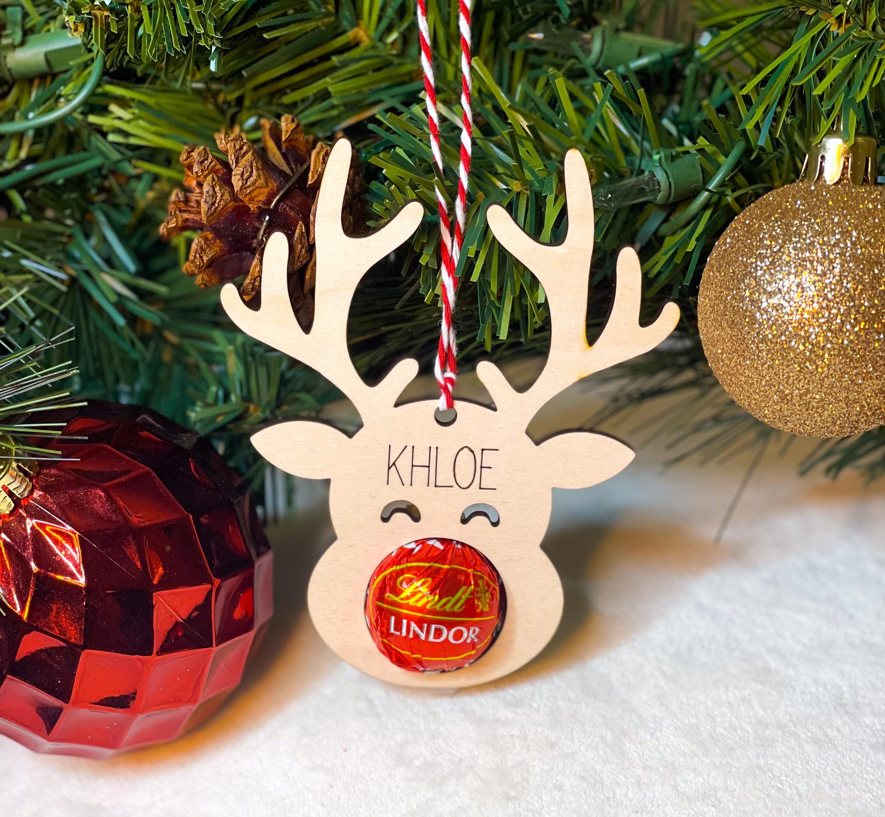 Our personalized reindeer ornament doubles as a Christmas ornament and chocolate holder for Lindt ch...
