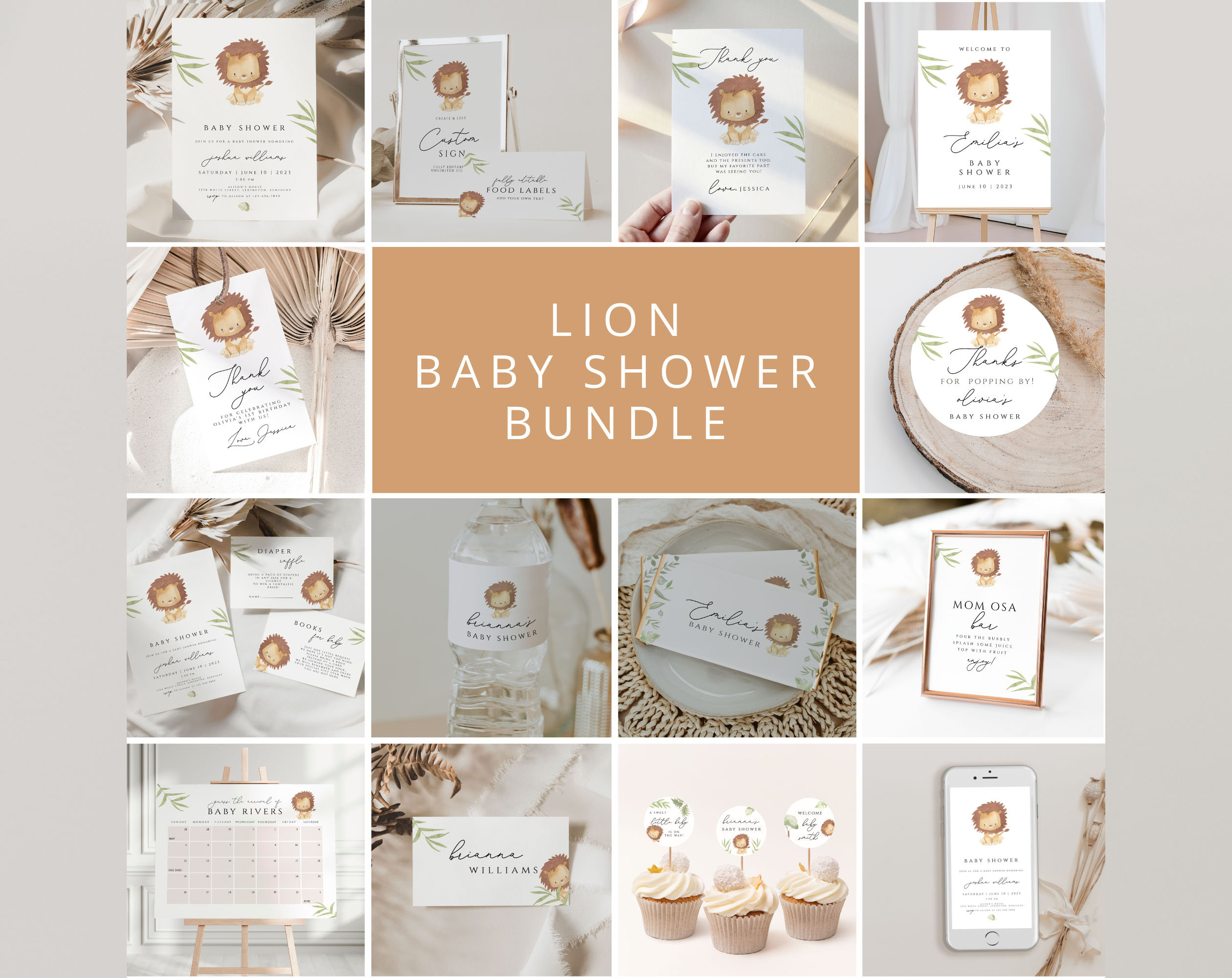 Fully editable lion safari Baby Shower Bundle Template, you can edit and download in your browser, u...