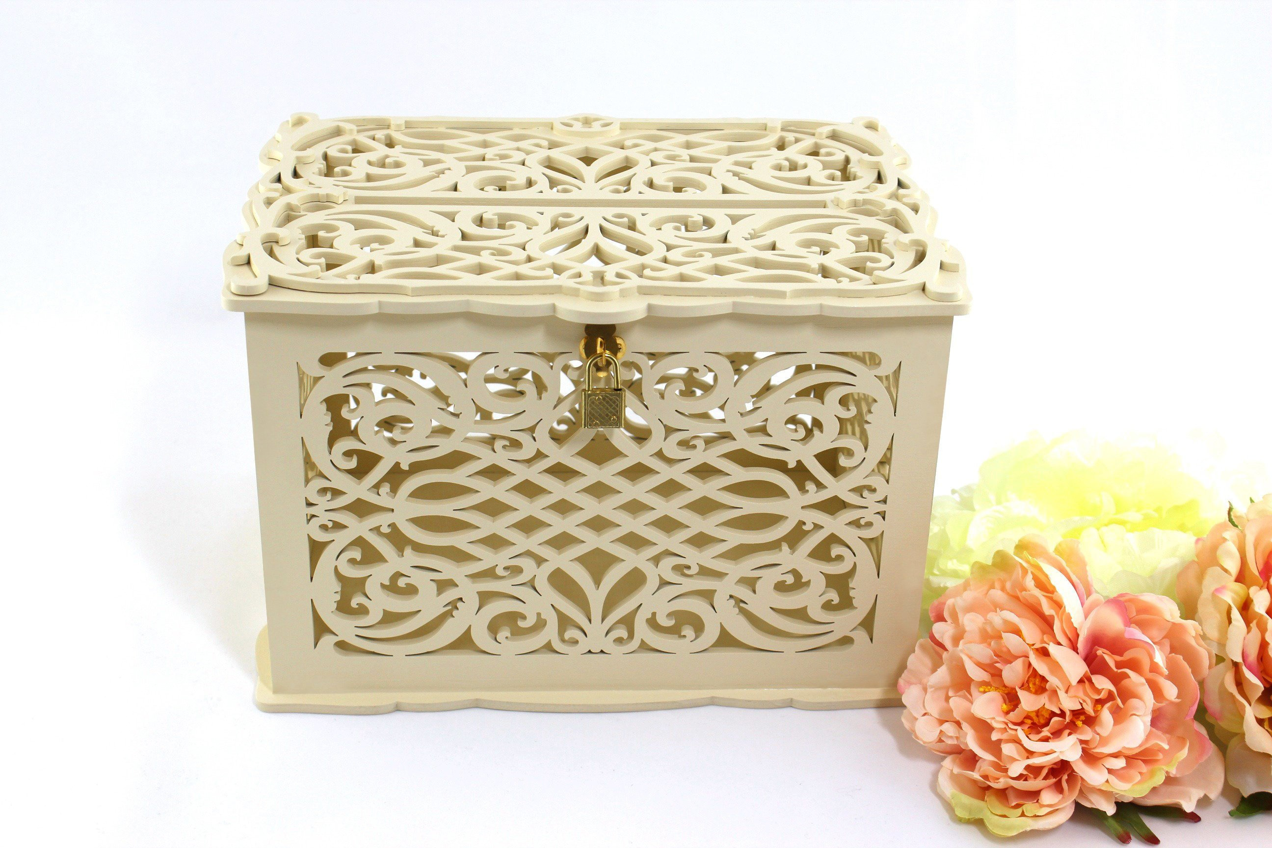 Personalized Ivory Card Box For Wedding With Slot And Lock, Wedding...