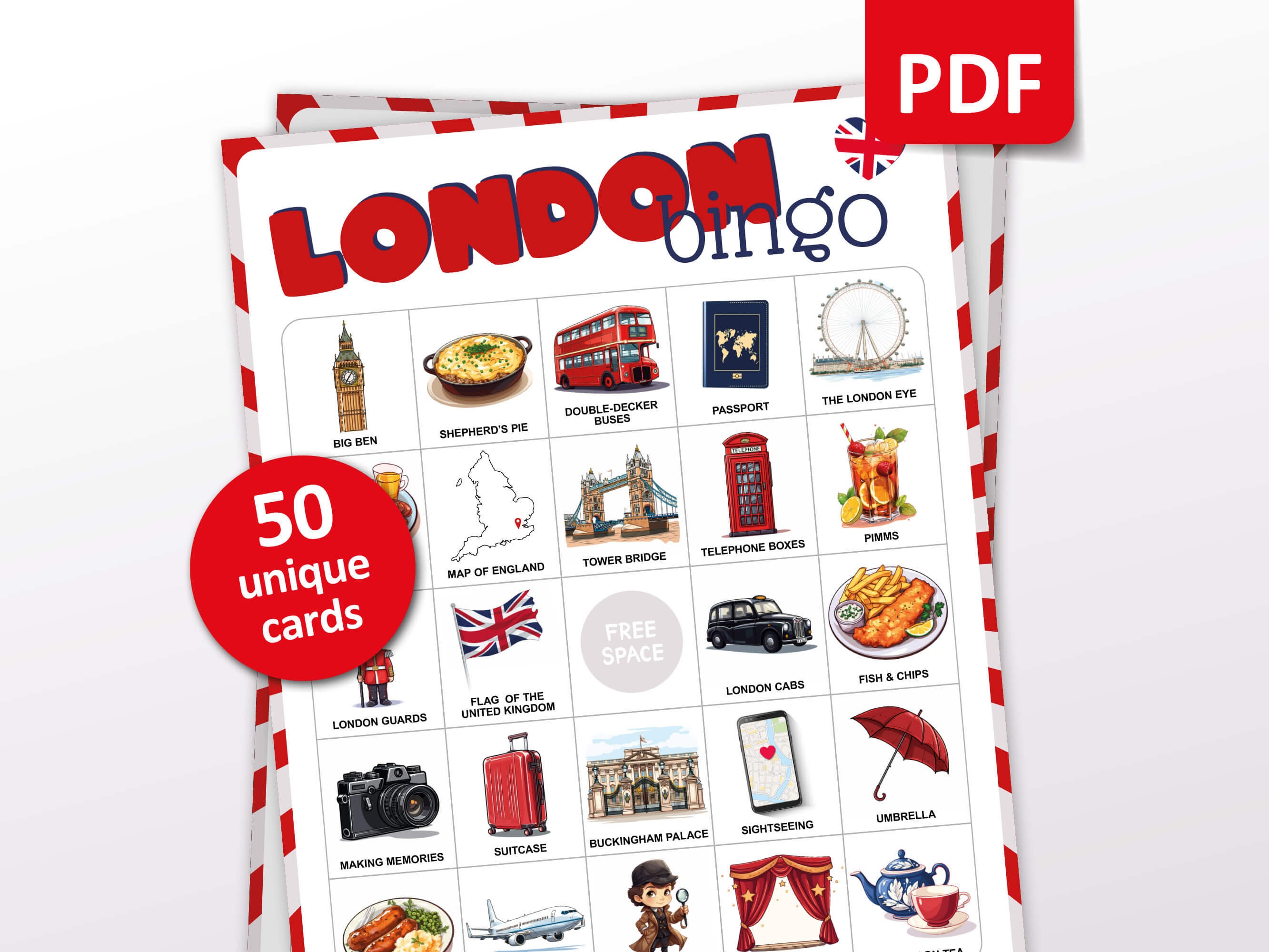 London Travel Bingo Game, 50 London Bingo Cards, Vacation Activitie...