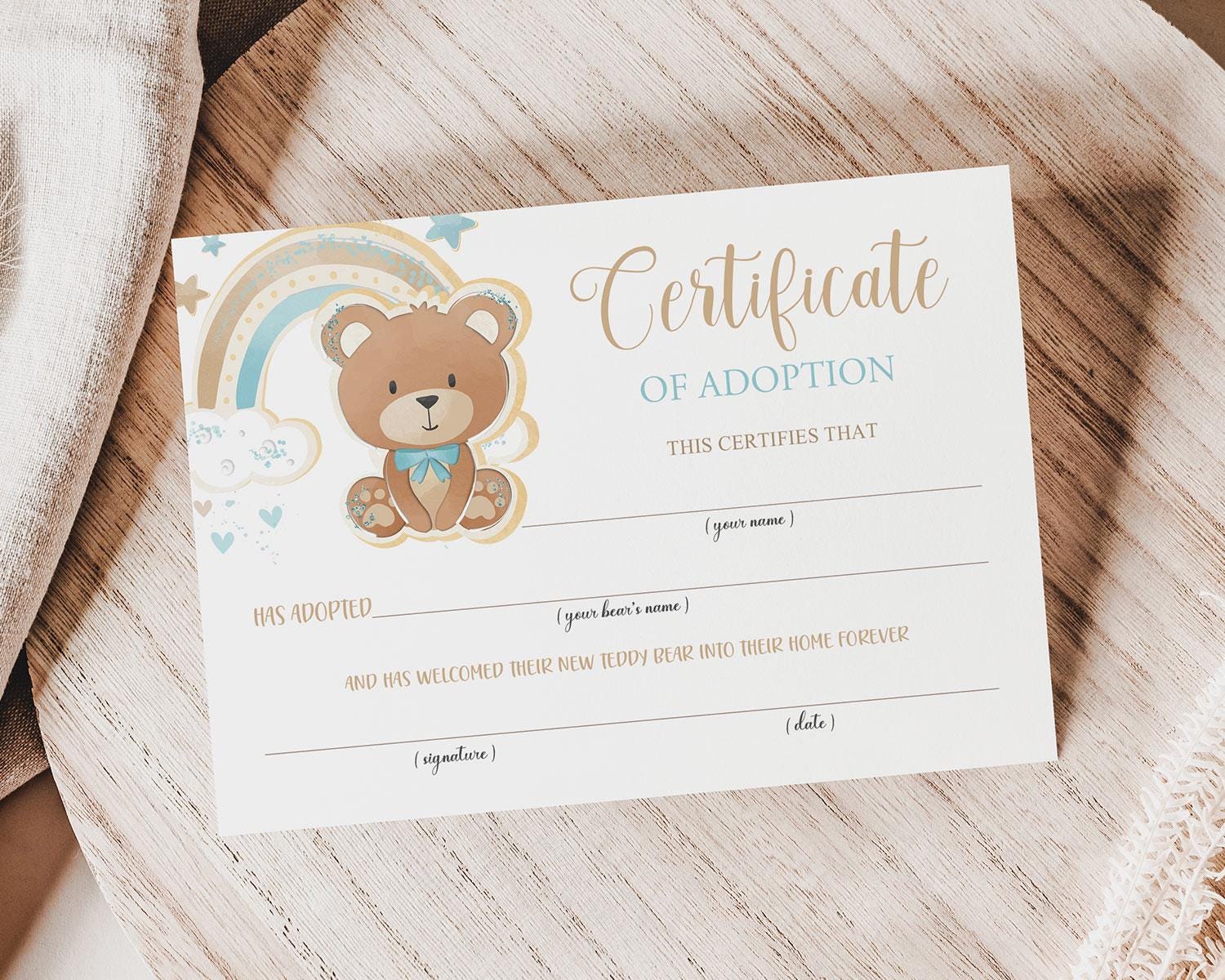 Teddy Bear Adoption Certificate, Boy Teddy Bear Party, Adopt a Stuf...