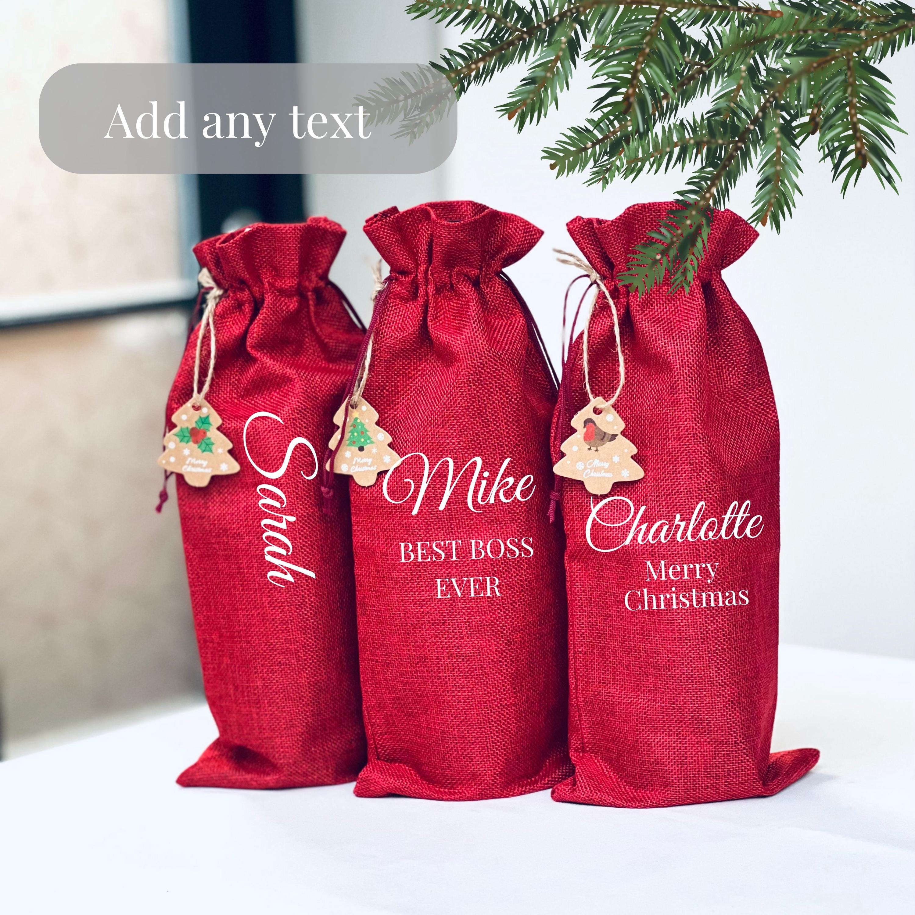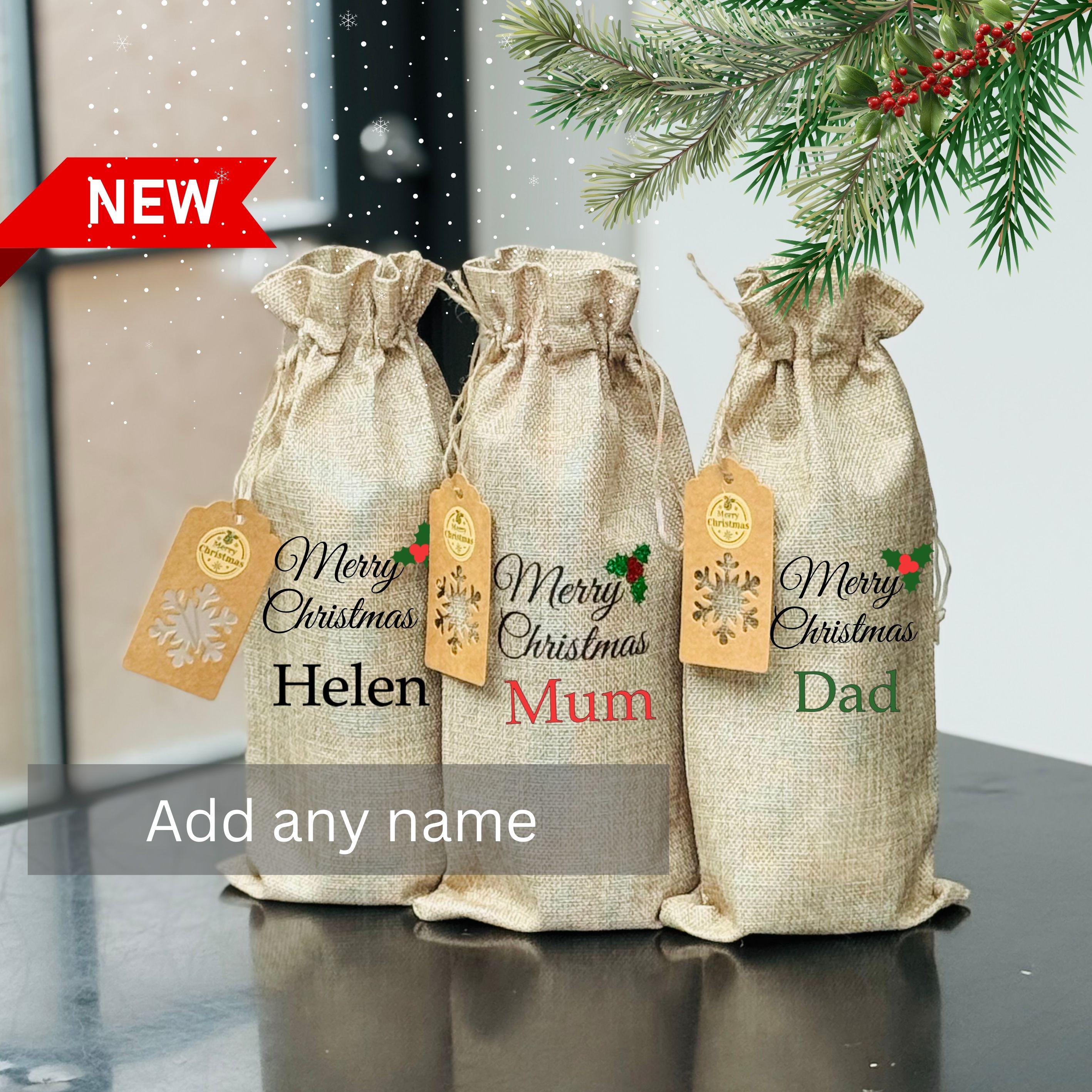 Personalised Jute wine bottle gift bag. All bags come with 'Merry Christmas' text and glittery holy ...