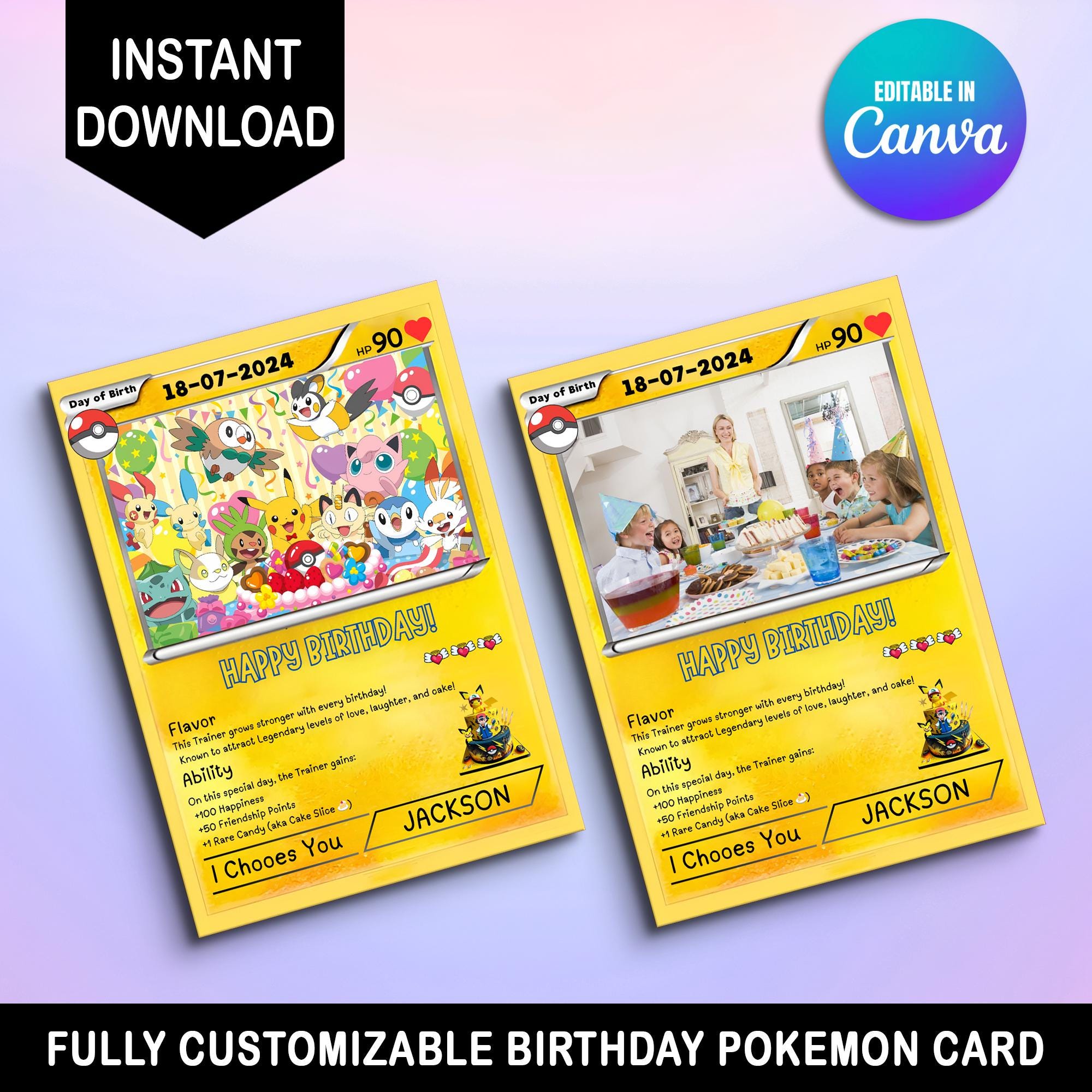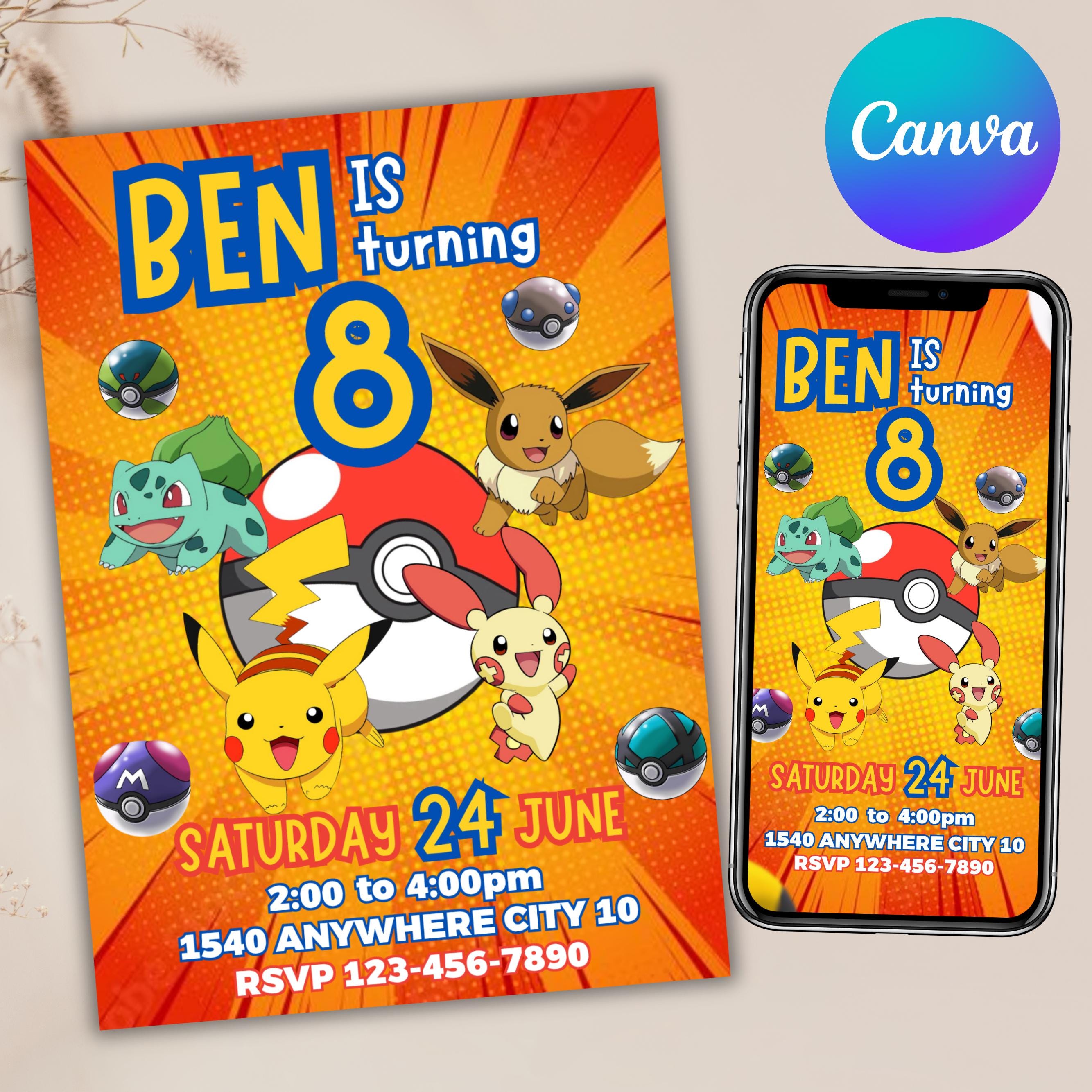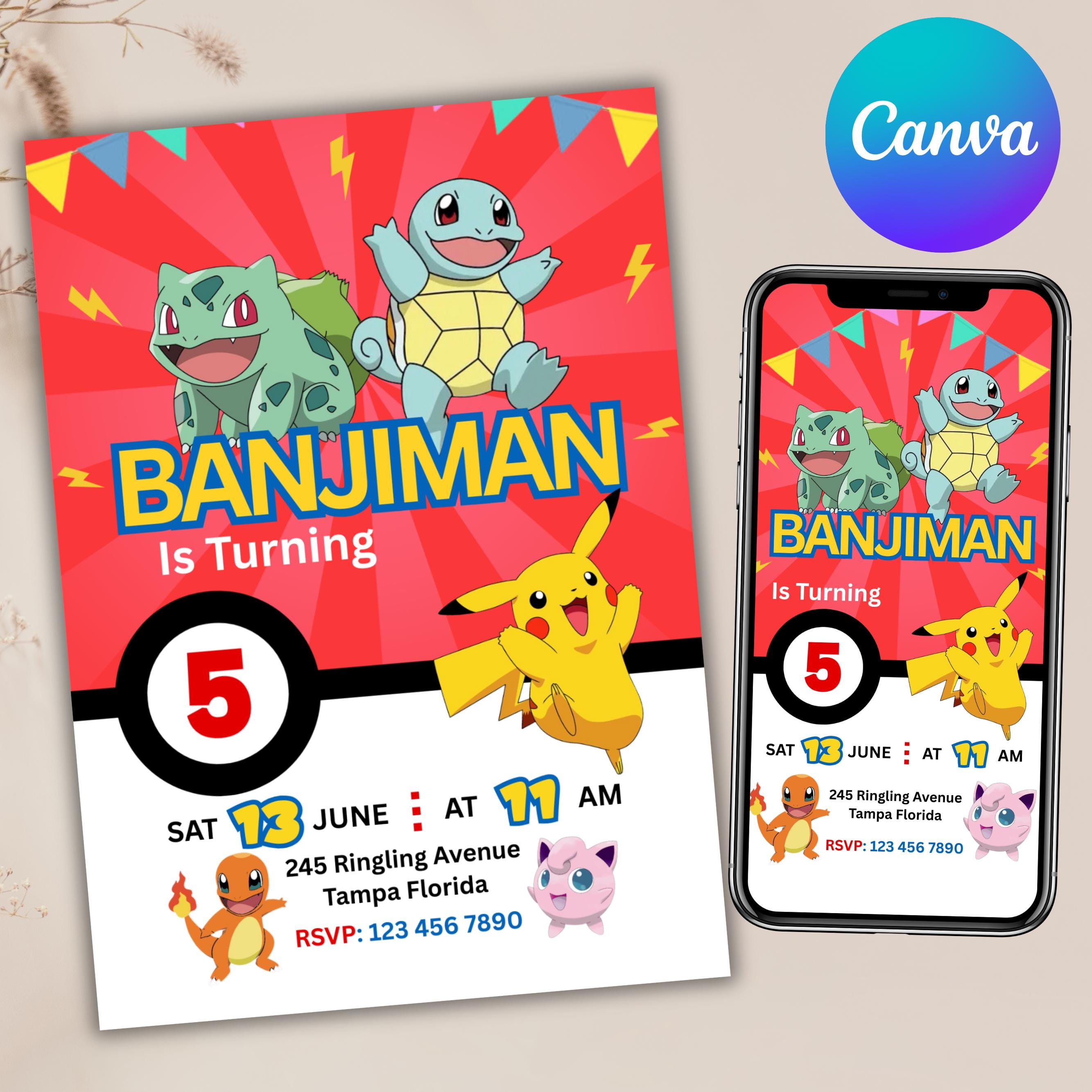 Pokemon Birthday Invitation, Pokemon Party Invite, Kids Card Template, Editable Canva Digital Downlo...