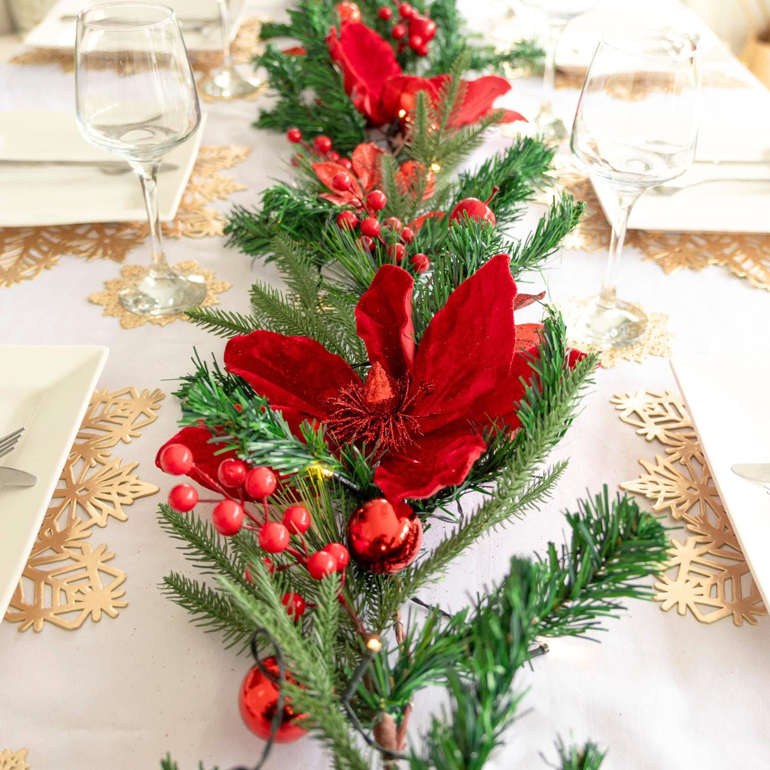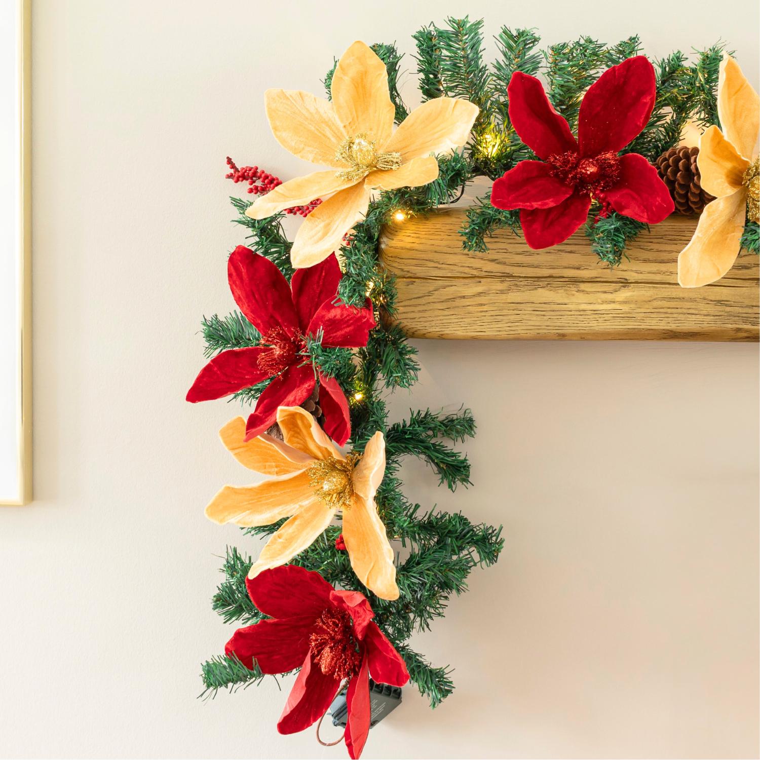 Christmas Artificial 9ft Garland with Red Poinsettia Pre-Lit LEDs i...