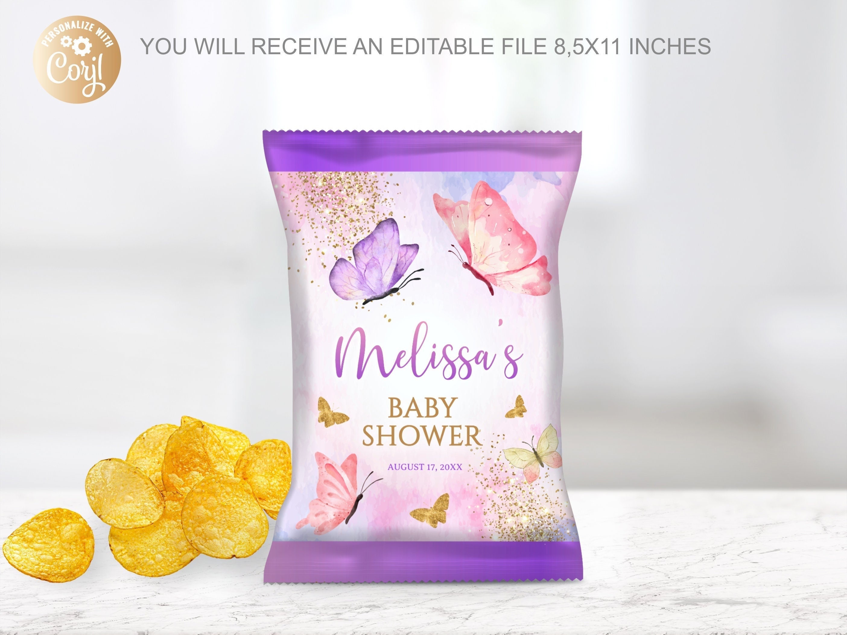 Editable Butterfly Chip Bags Watercolor Purple Pink,Girl Pink Purpl...