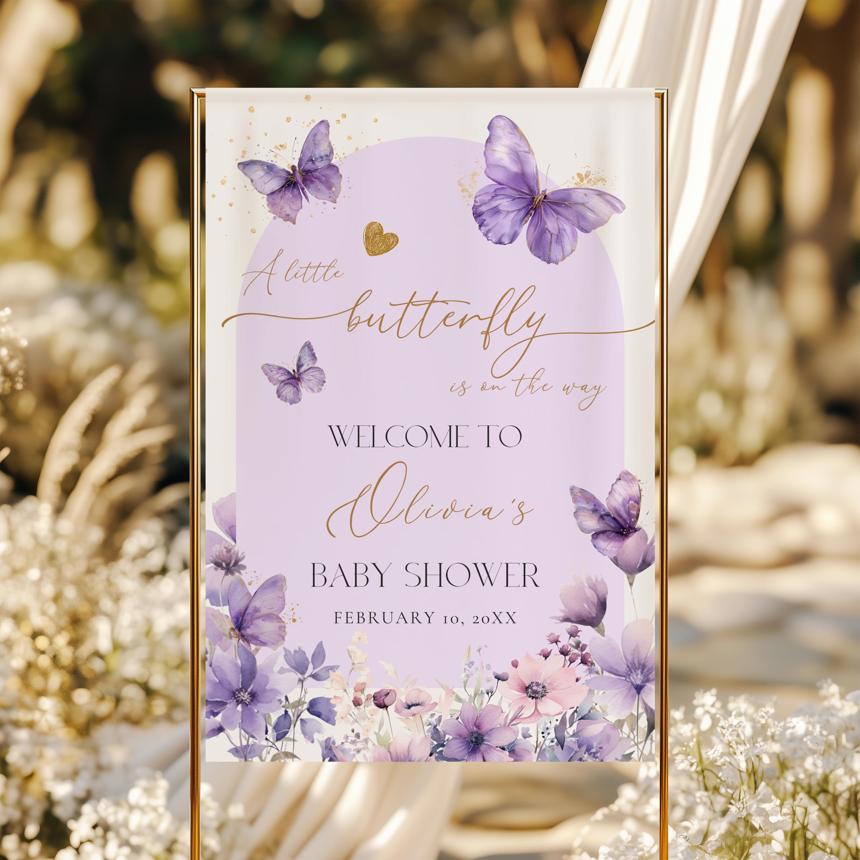 Purple Butterfly Baby Shower Welcome Sign, Editable Purple Butterfl...