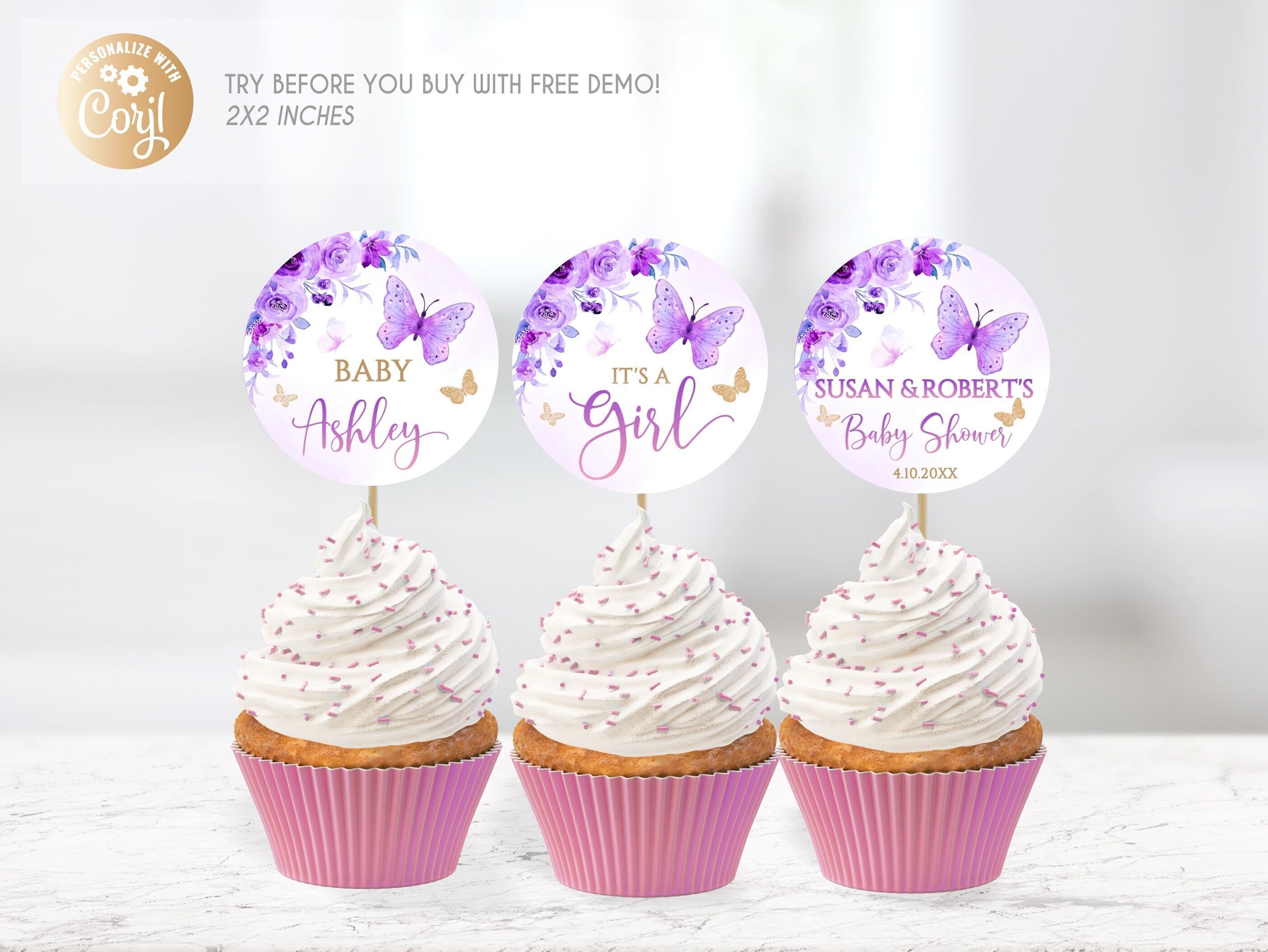 Editable Cupcake Butterfly Print Baby Shower Circle Purple, Butterf...
