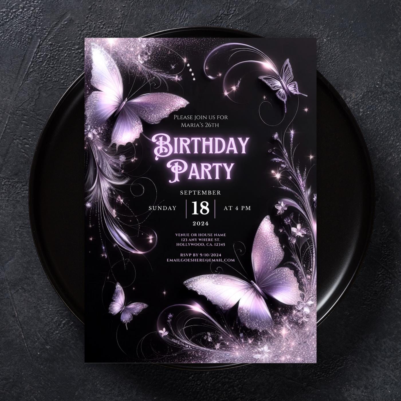Purple and Black Floral Butterfly Birthday Party Invitation | Purpl...