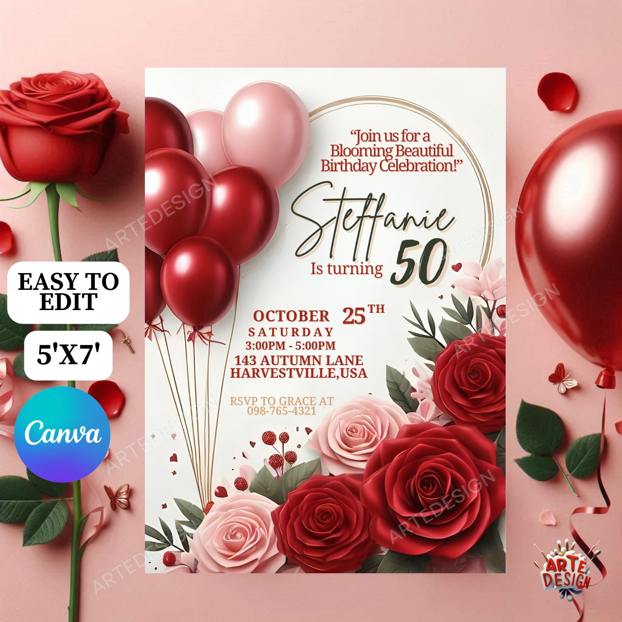 Red Rose Birthday Invitation, Rose Flower Birthday Party Invitation...
