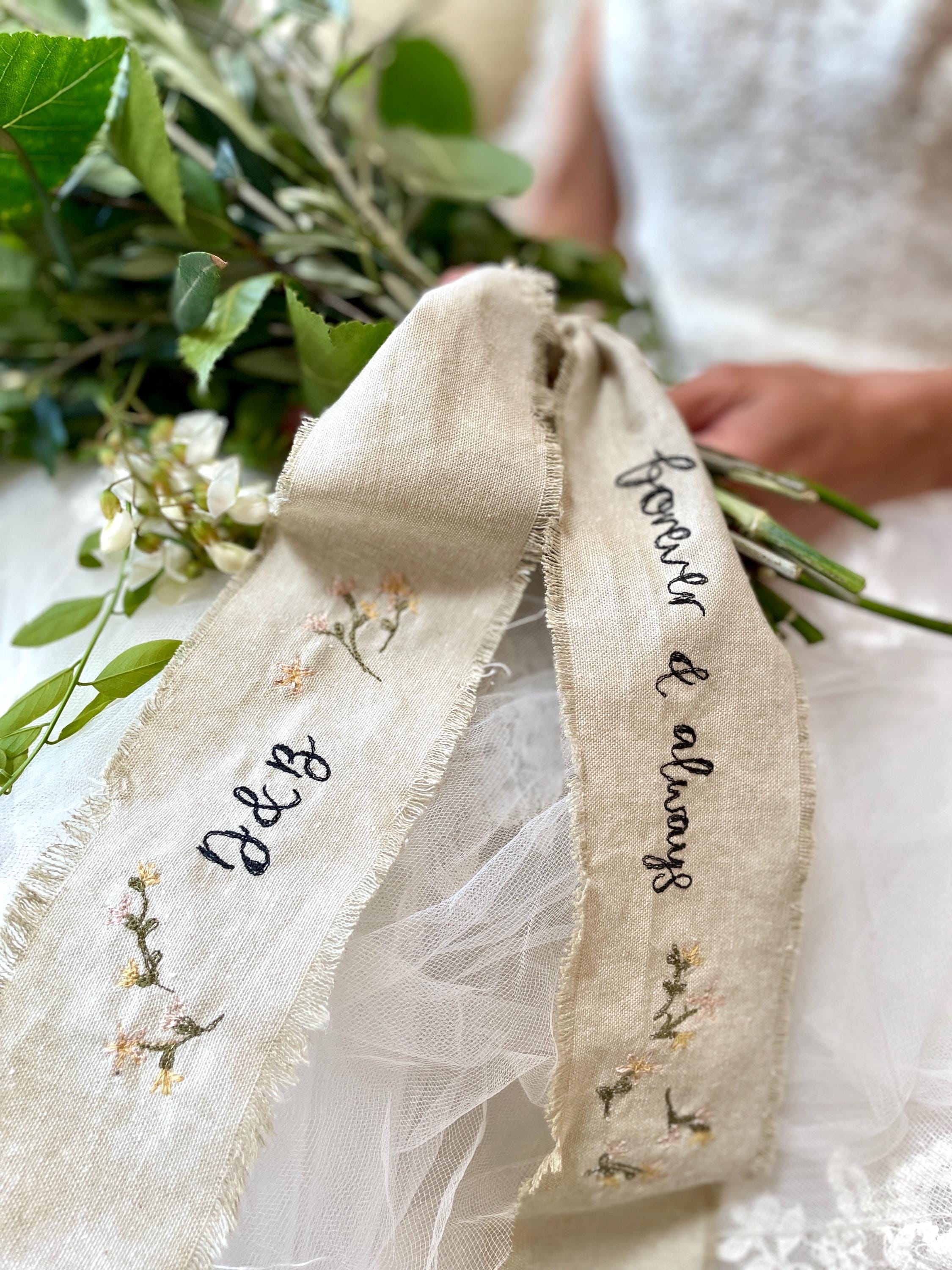"Bespoke Embroidered Linen Bouquet Ribbon - Custom Bridal Keepsake with Freehand Floral Detail ...