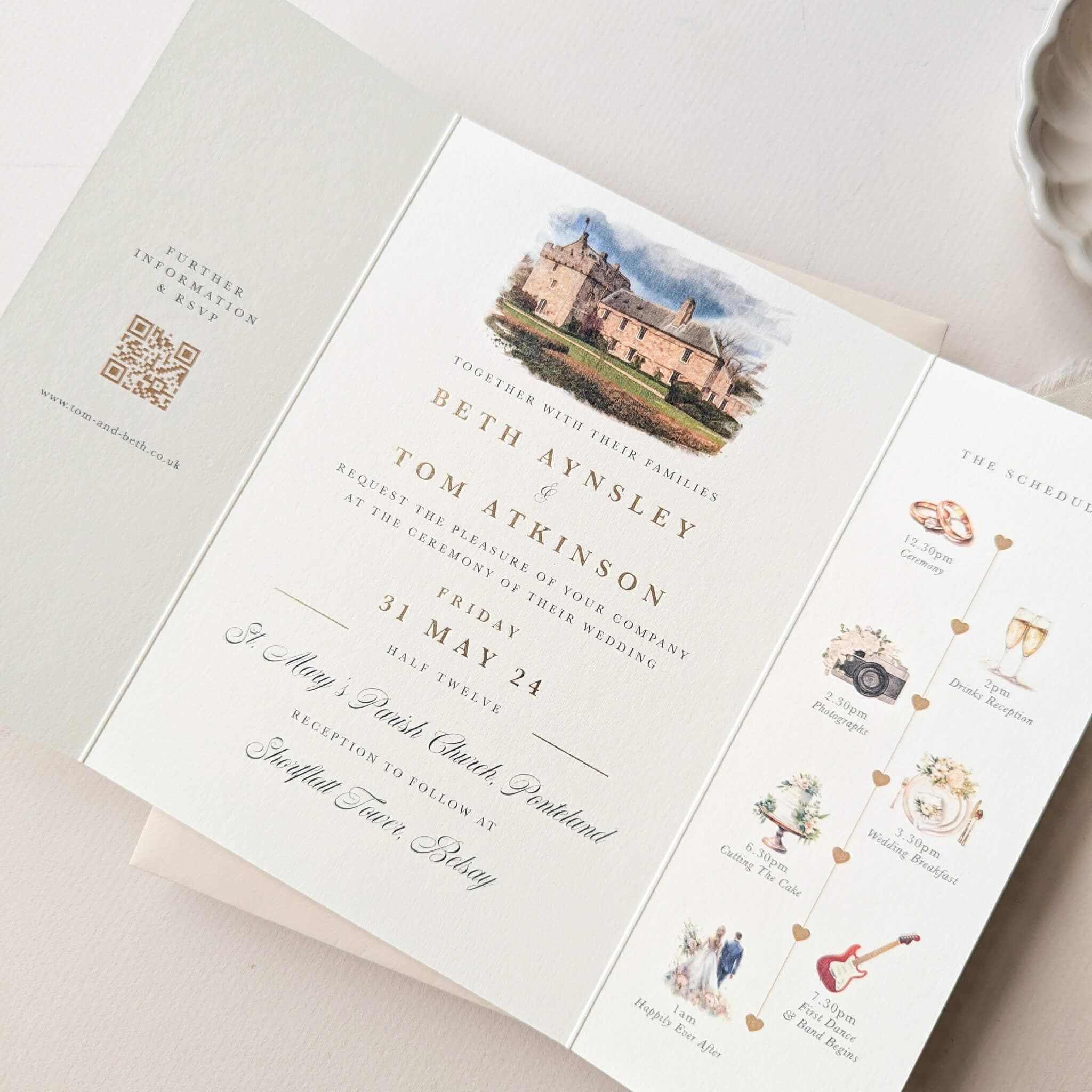 SAMPLE ONLY These beautiful tri-folded wedding invitations come personalised with a hand-drawn illus...