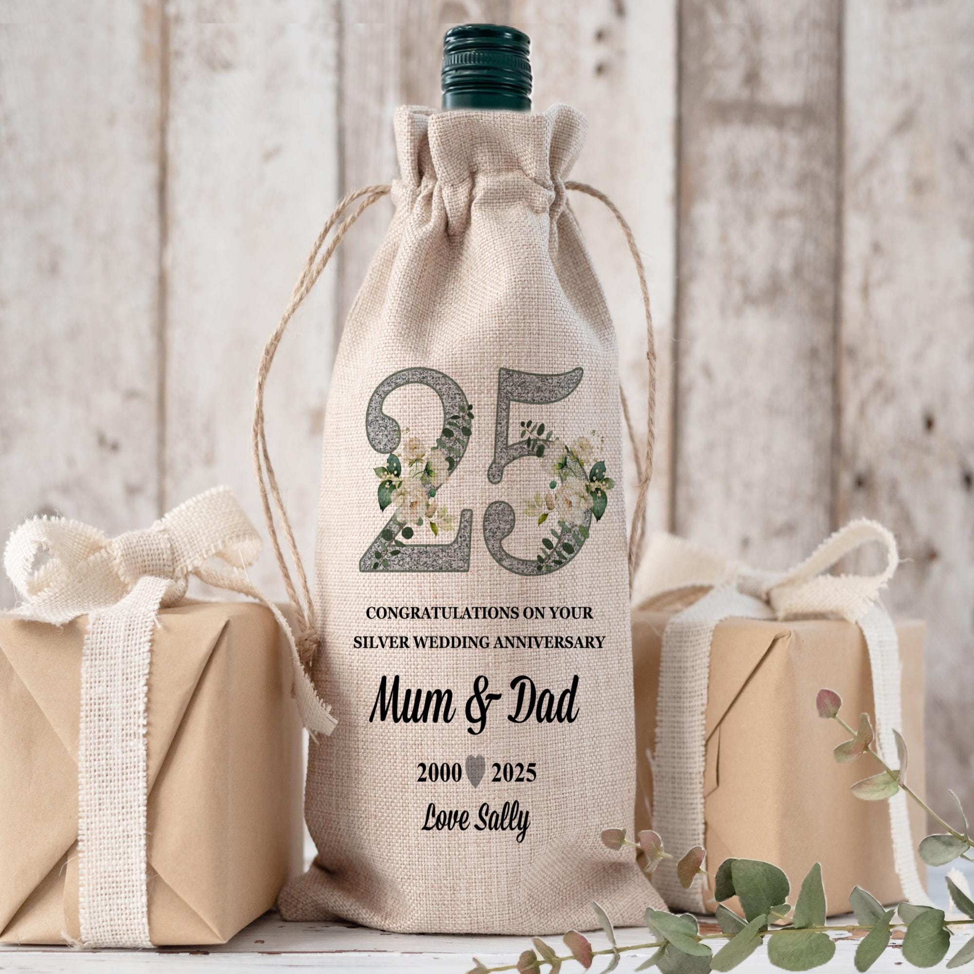 25th Anniversary Hessian Wine Bag | Rustic Burlap Bottle Gift | Sil...