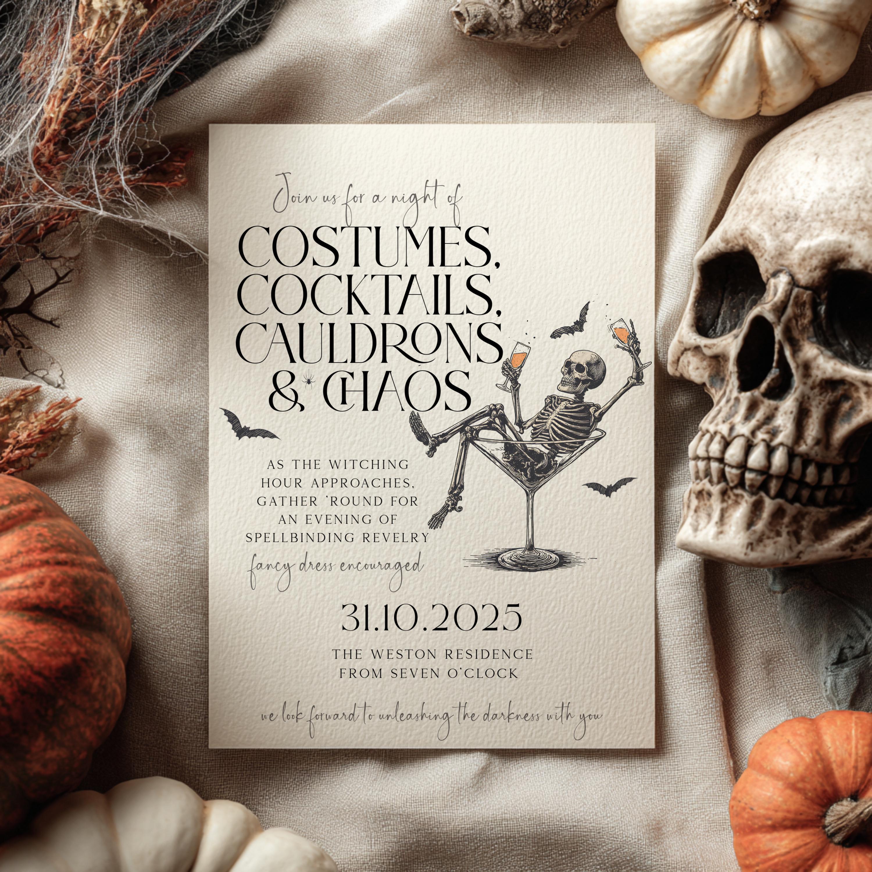 Editable Costumes & Cocktails Skeleton Invitation - Halloween P...