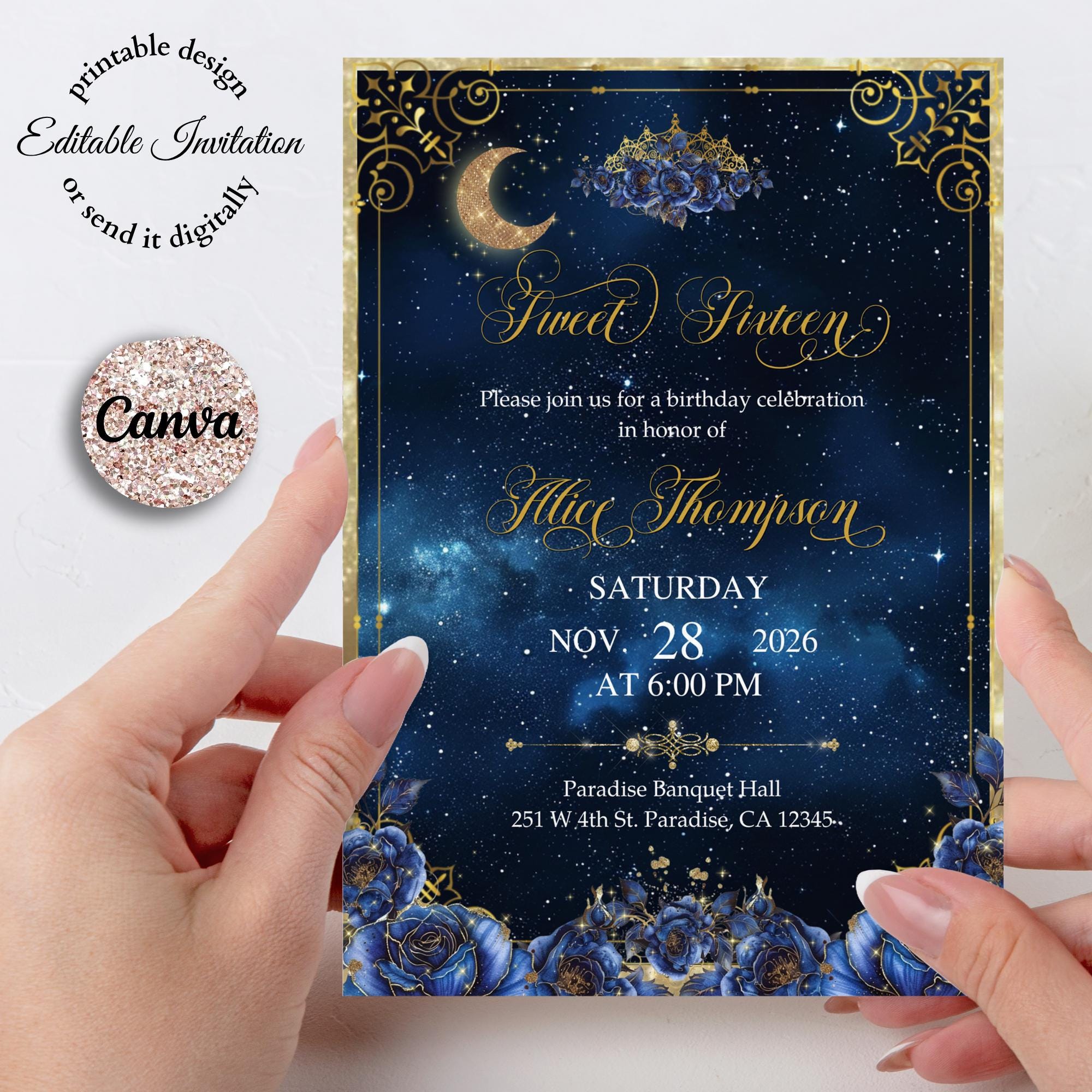 Sweet 16 Invitation - Printable Template Editable Download - Gold a...