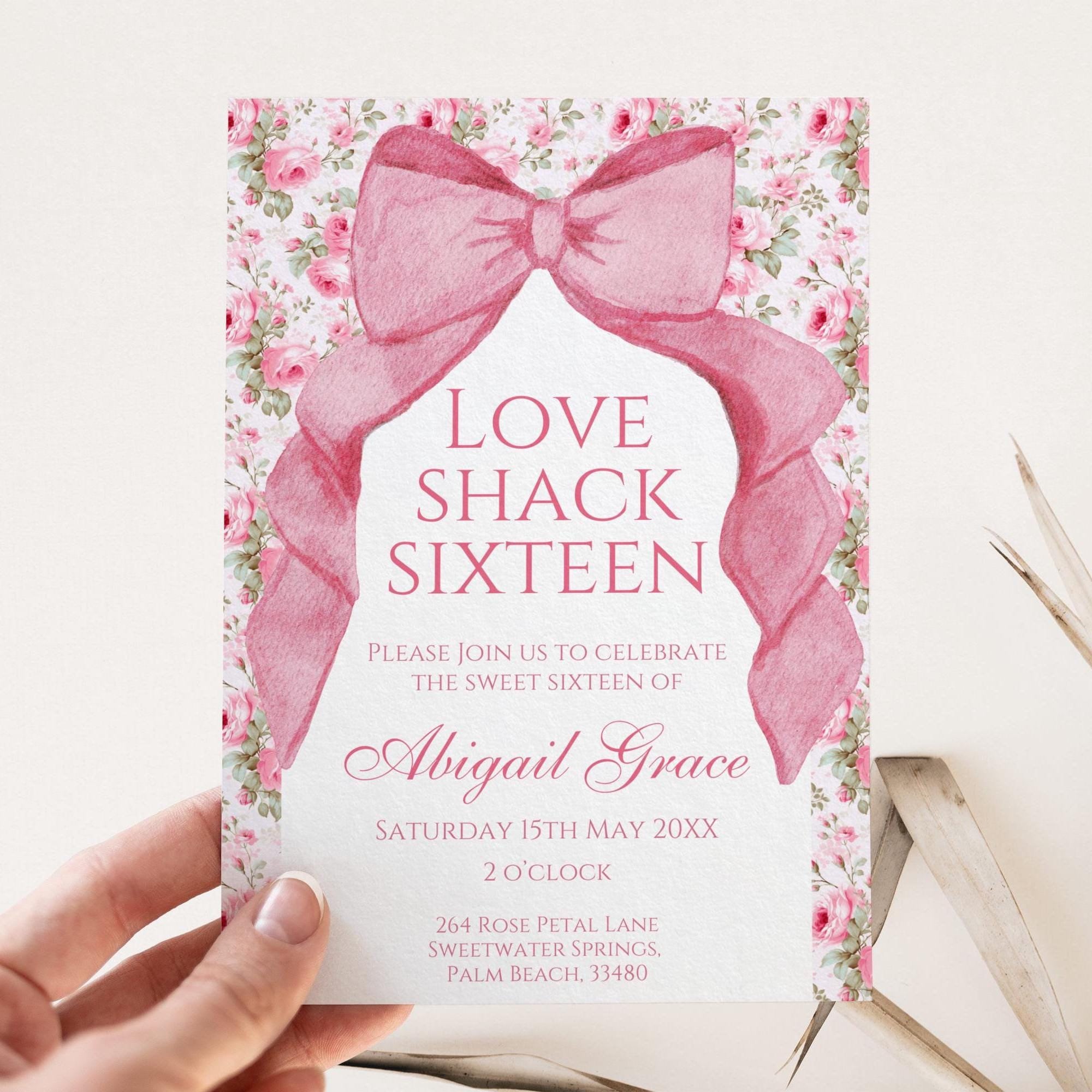 Coquette Pink Bow Sweet 16 Invitation Template, Love Shack Fancy Sw...