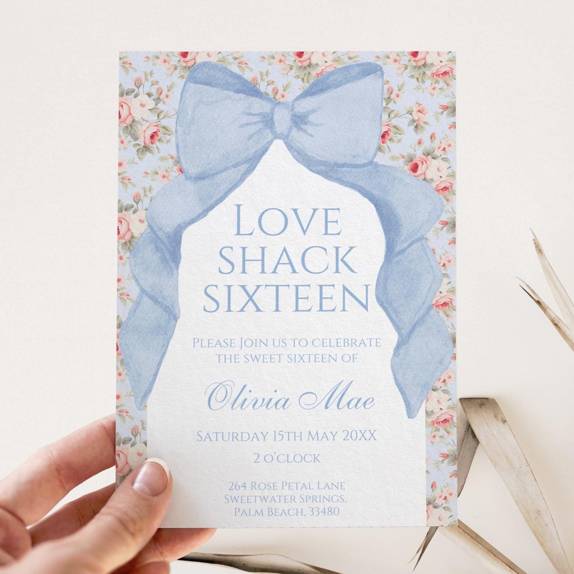 Coquette Blue Bow Sweet 16 Invitation Template, Love Shack Fancy Sw...