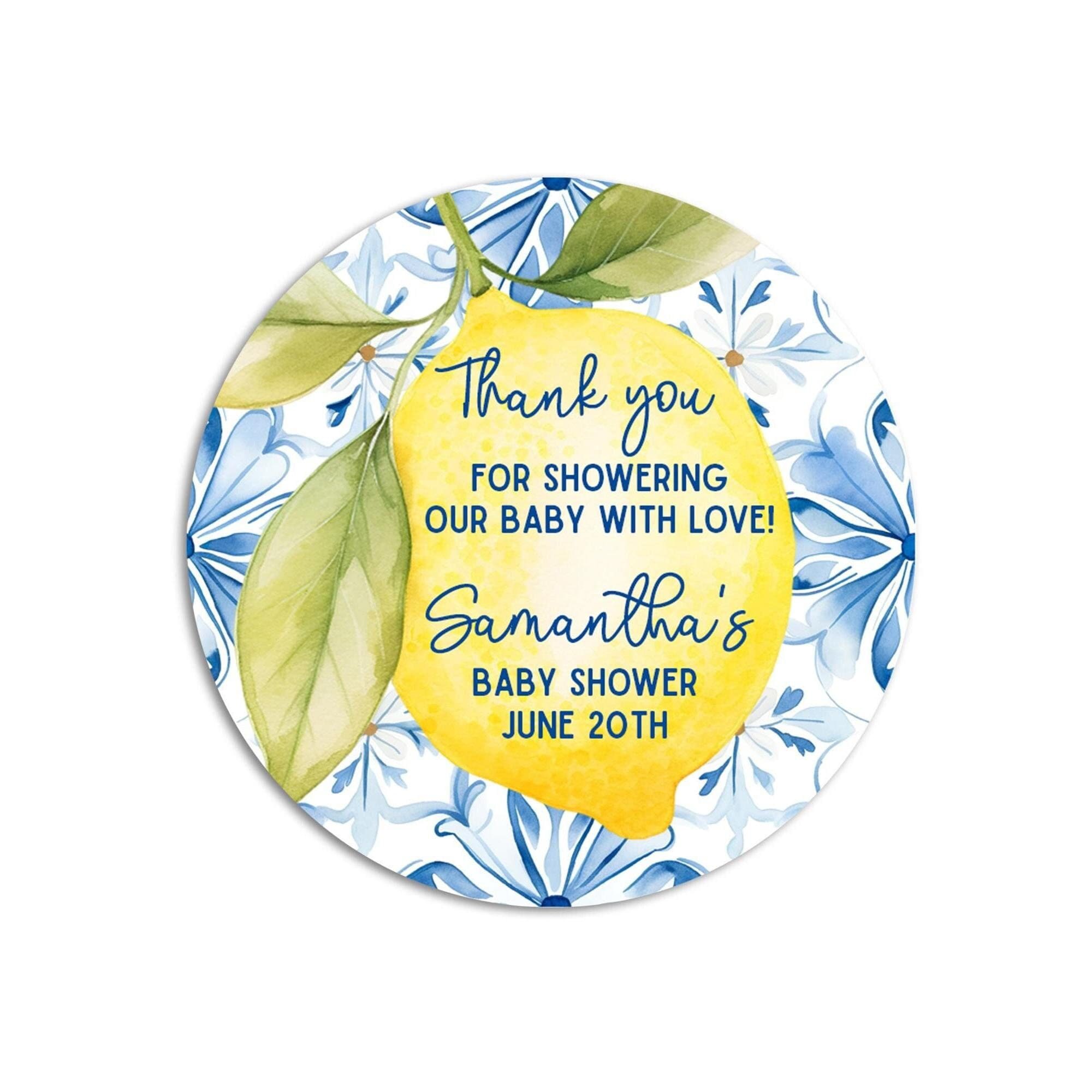 "Show your gratitude to guests with our Lemon with blue tiles Baby Shower personalized round st...