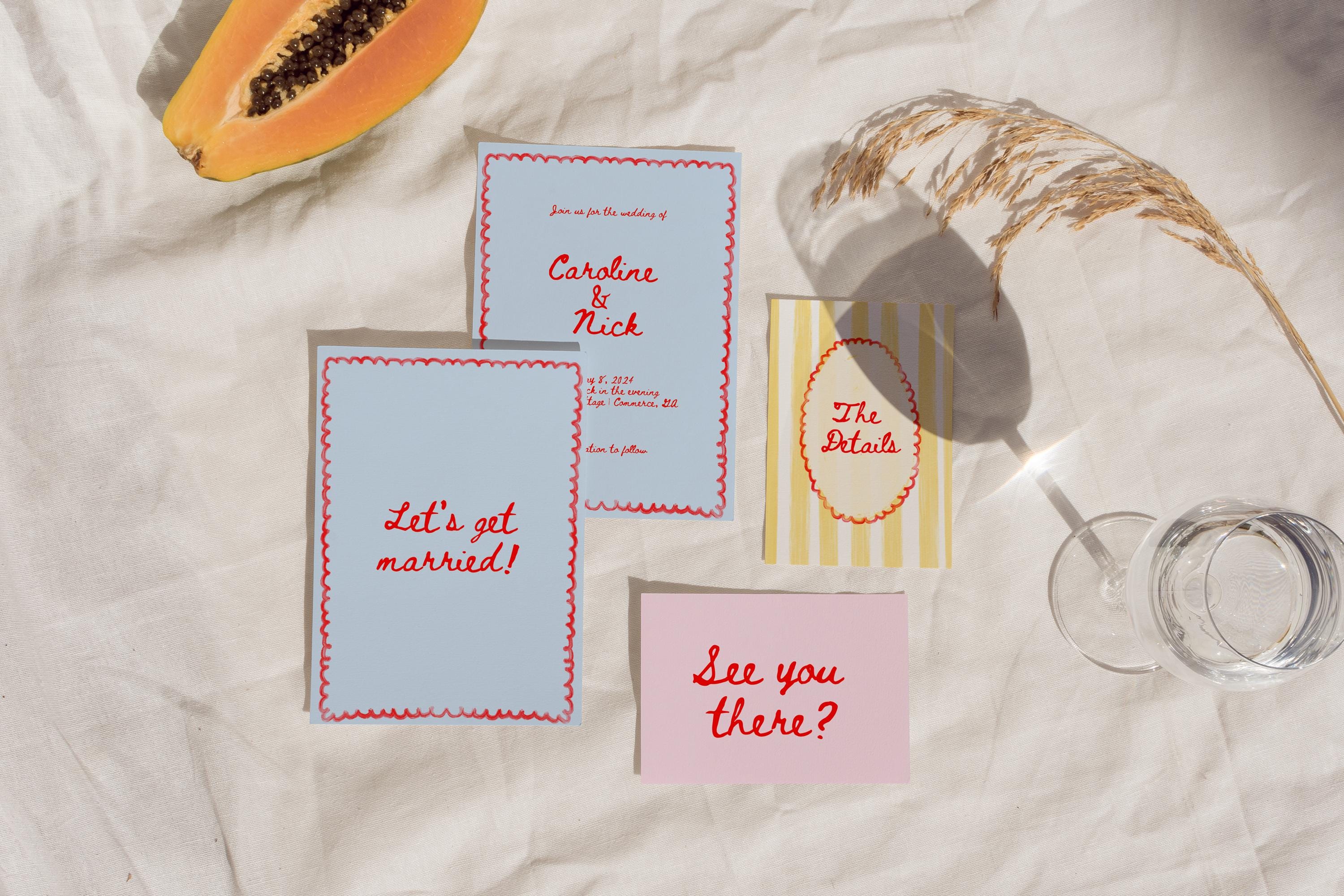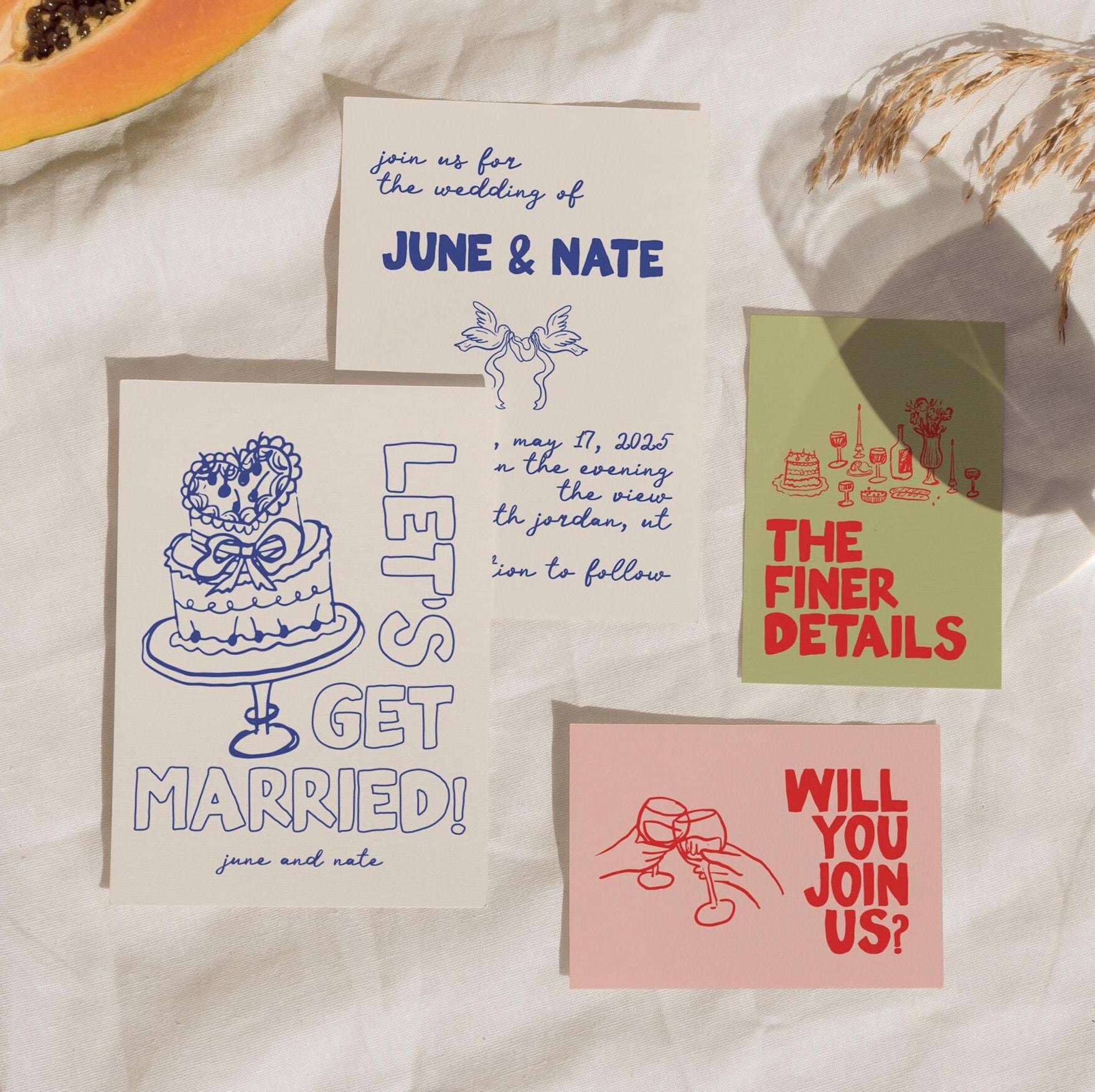 "This hand-drawn wedding stationery suite is perfect for couples looking to bring a cheerful, I...