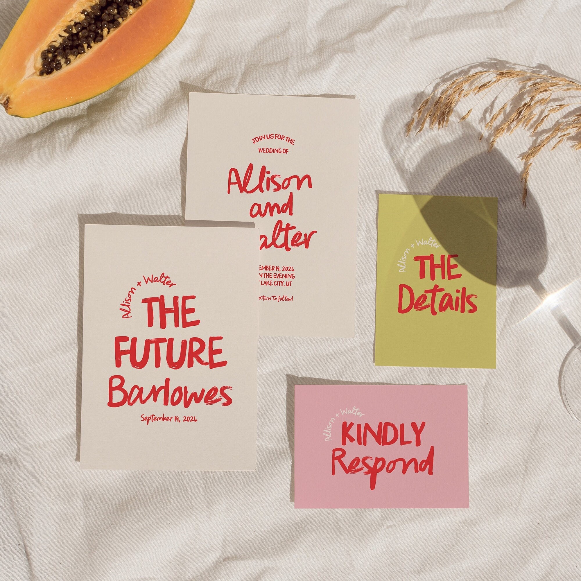 A colorful, modern wedding invitation suite - colors and wording can be customized to whatever you w...