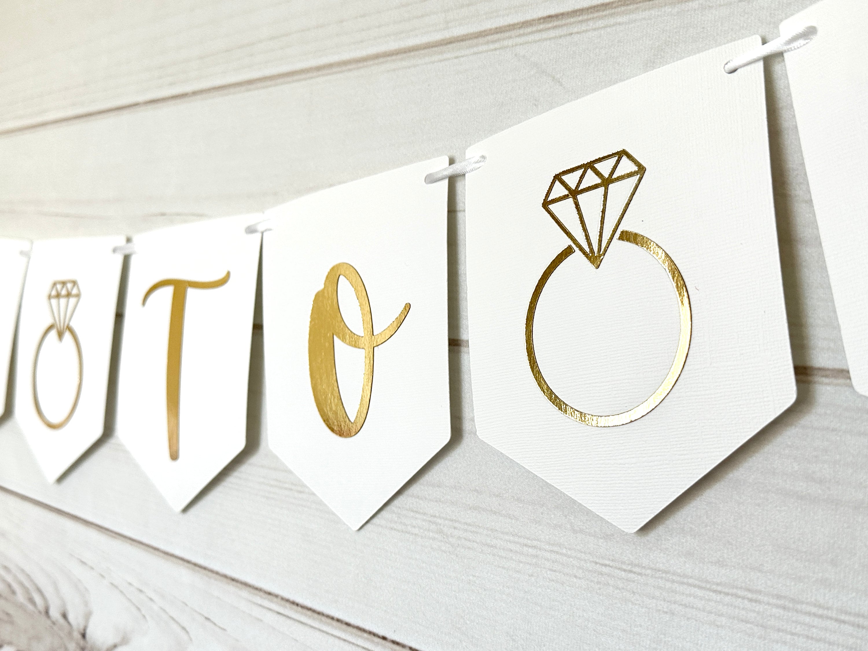 "This listing is for a gold and white \"Bride To Be\" banner. It's the perfect additi...
