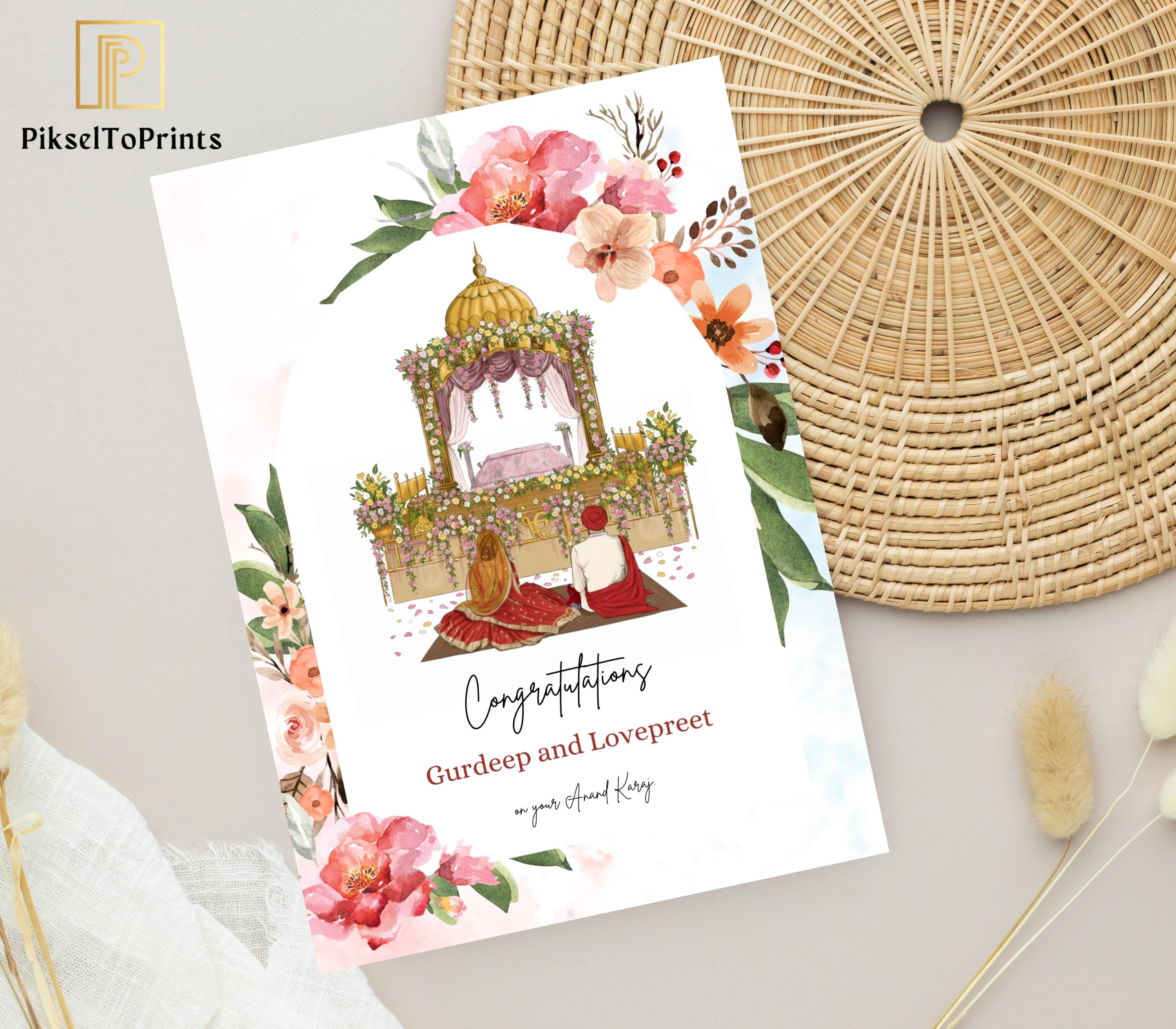 Sikh Wedding Congratulations Card: Floral Red Anand Karaj Vadai Car...