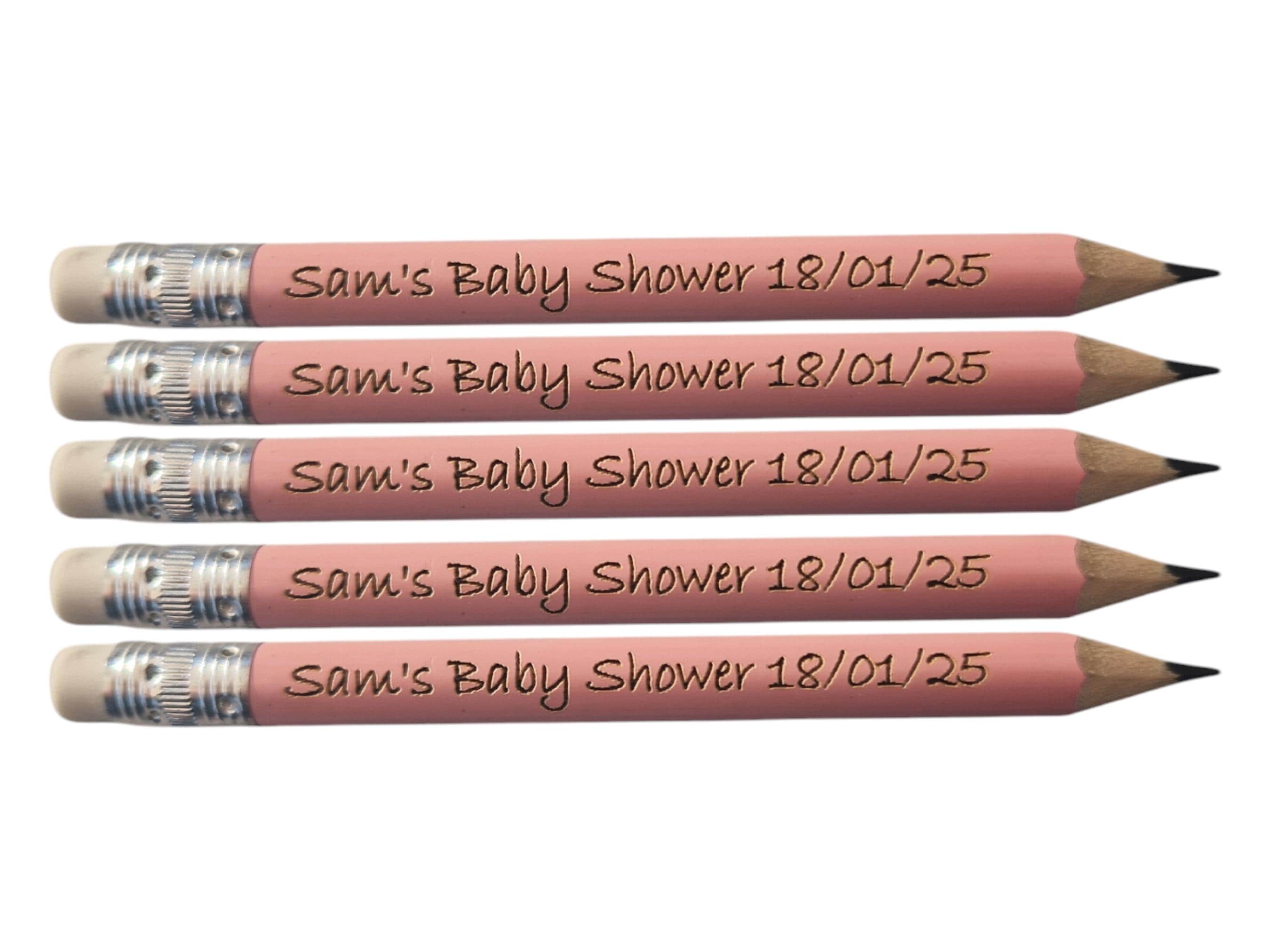 Personalised light pink mini pencils with rubber, baby shower penci...